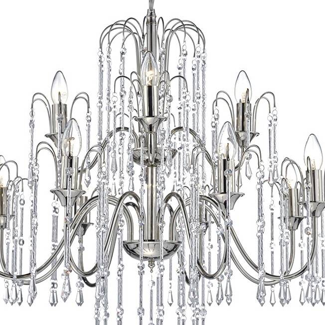 A stunning 12 light chandelier - the cascading crystal beads and etched twisting metal rods create a sparkly 'waterfall' effect around the polished nickel frame.