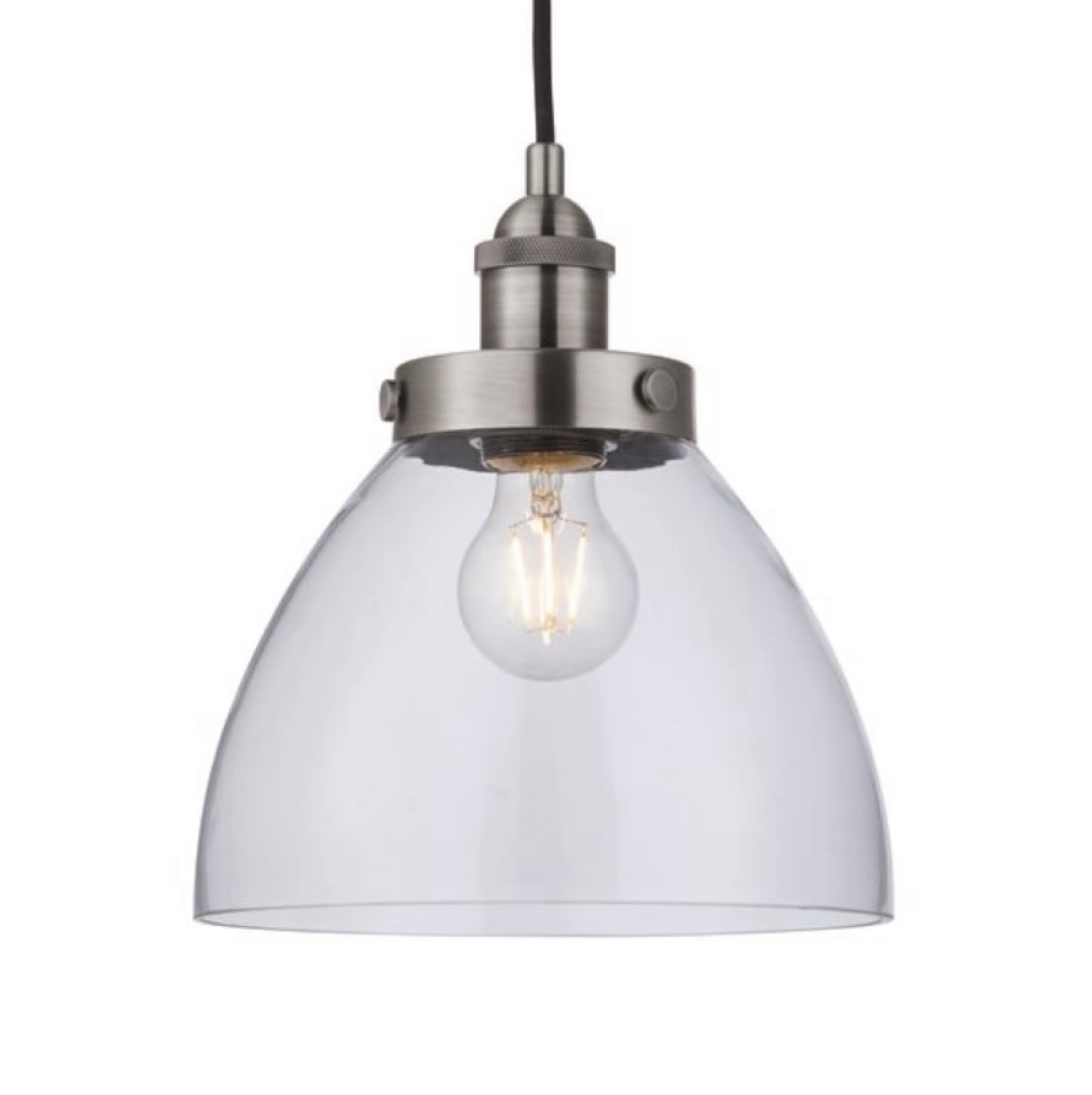 An authentic 'resto' style Ernest – Industrial Pendant Light with Glass Shade, finished in brushed silver paint with authentic knurled lamp holder details and clear glass shades. Suspended from height adjustable black fabric flex, pair with filament LED lamps for that perfect industrial style. The perfect addition for today's stylish homes to create that on trend bar, bistro look.