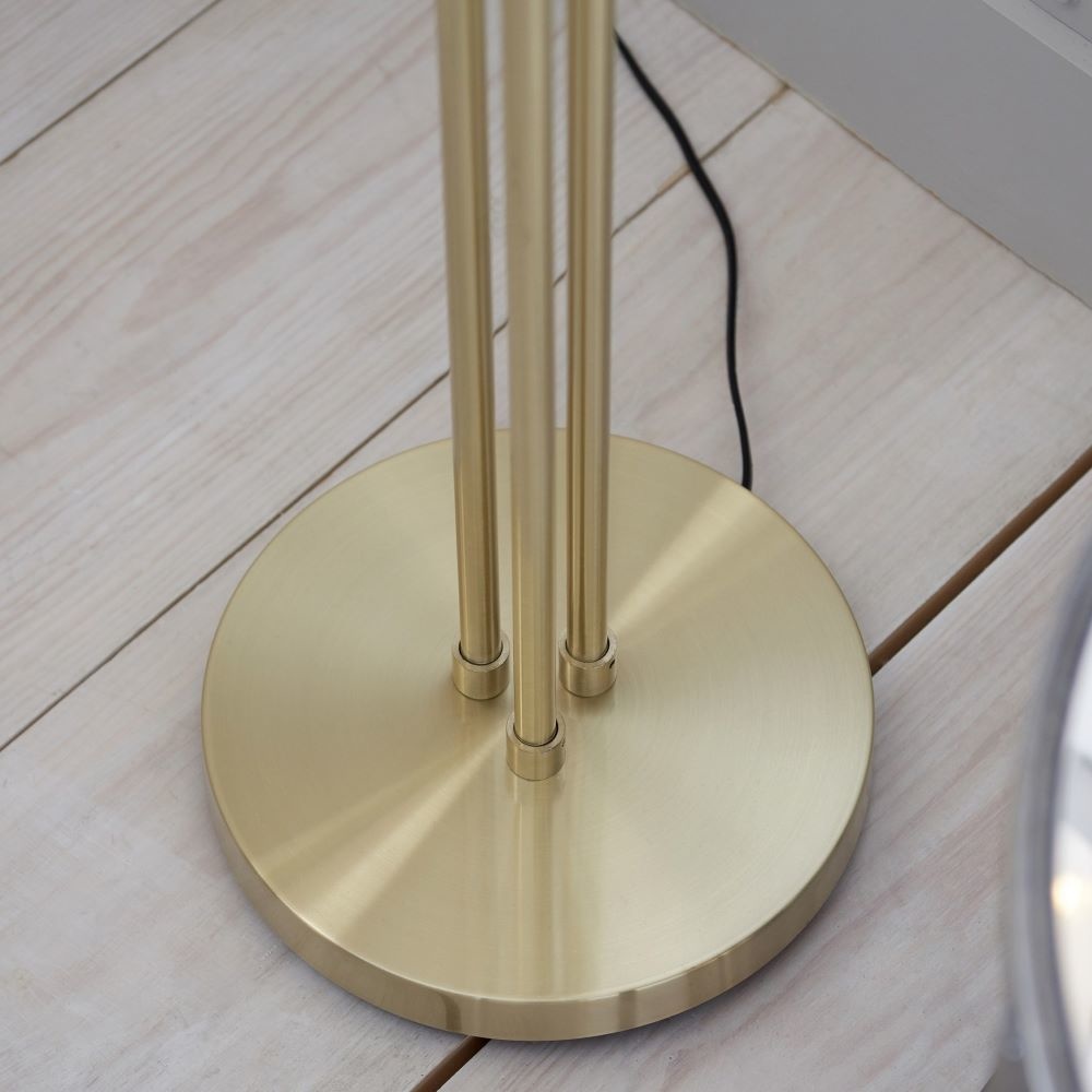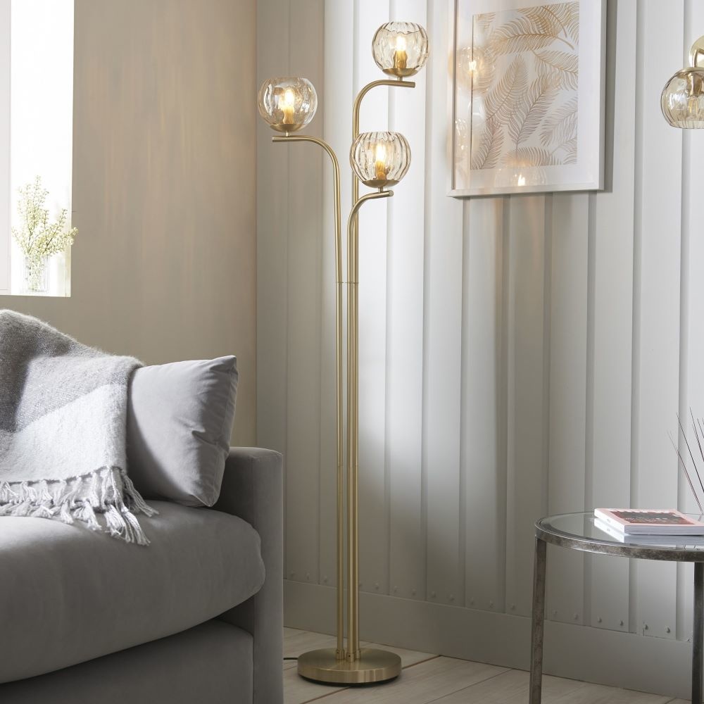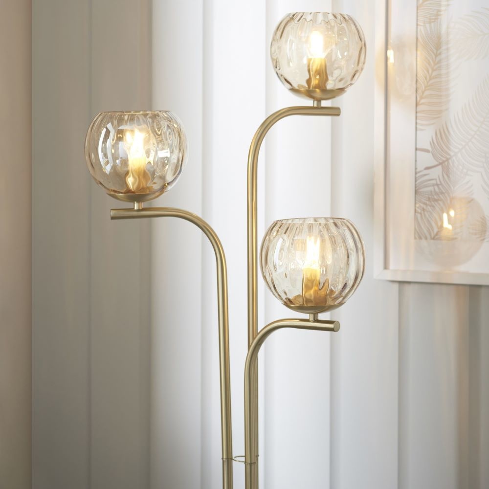 Champagne lustre, amber glass meets modern brushed brass plating in a combination of modern classic styling. This stunning Multi Light Floor Lamp is the perfect addition to your modern home.