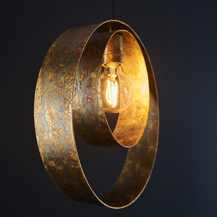 A beautifully crafted, hand finished dappled copper & gold patina finish makes this pendant a statement piece for any room.