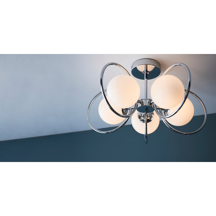 The Saturn 3 Light Semi Flush Ceiling Light mixes a range of on trend looks into one fitting; highly reflective chrome plated arms and soft opal glass spheres combine in this multi-arm design. Compact enough to create an impact even on low ceilings.