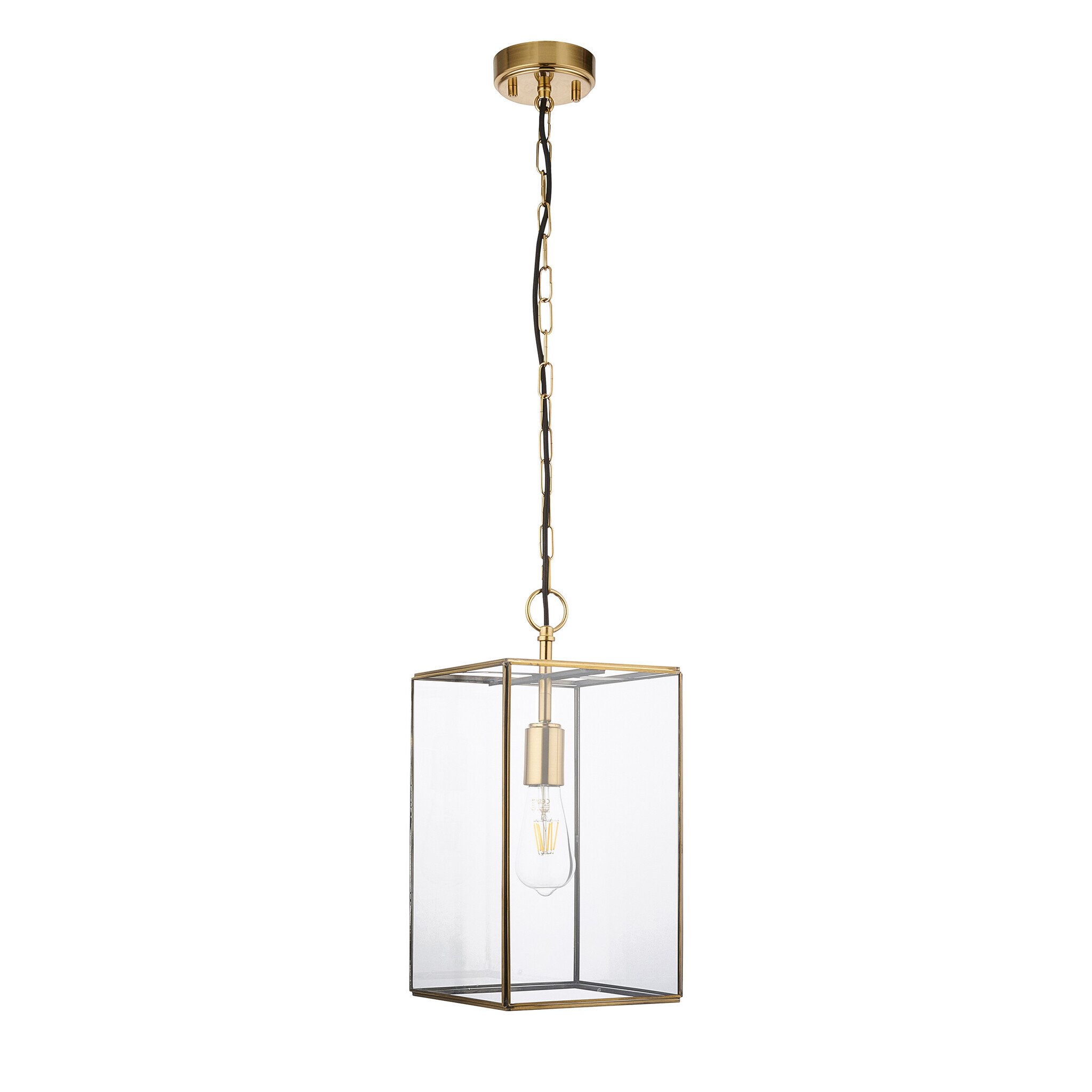 This grand pendant showcases timeless styling with brushed aged brass metalwork and clear glass panels for a refined, classic look.