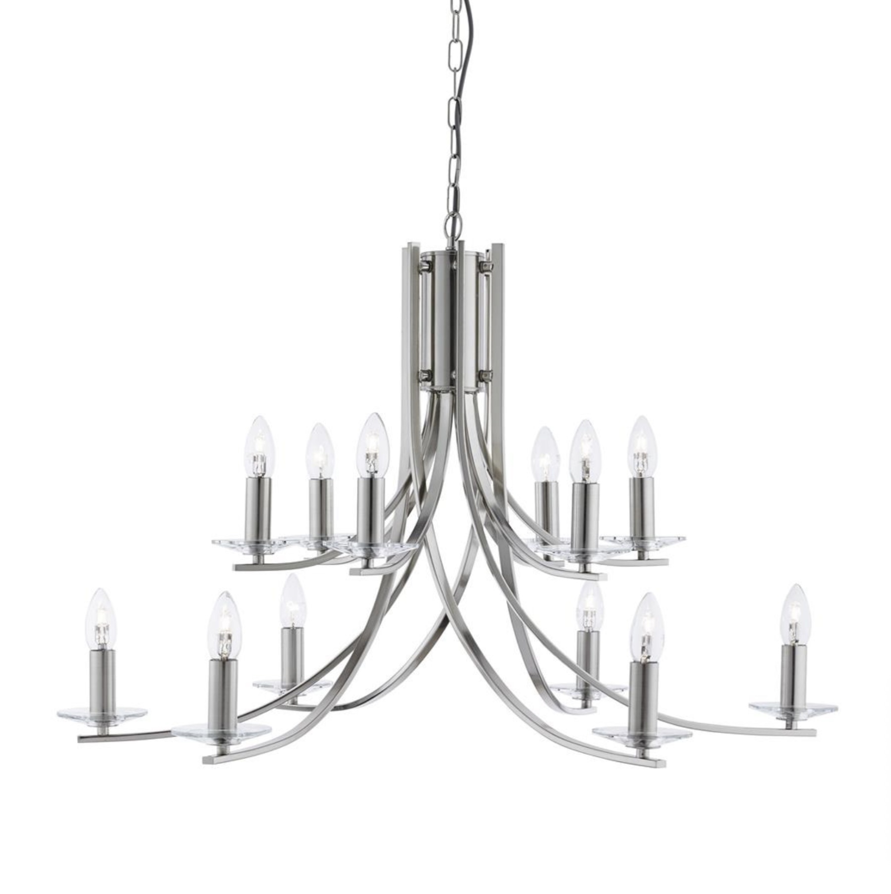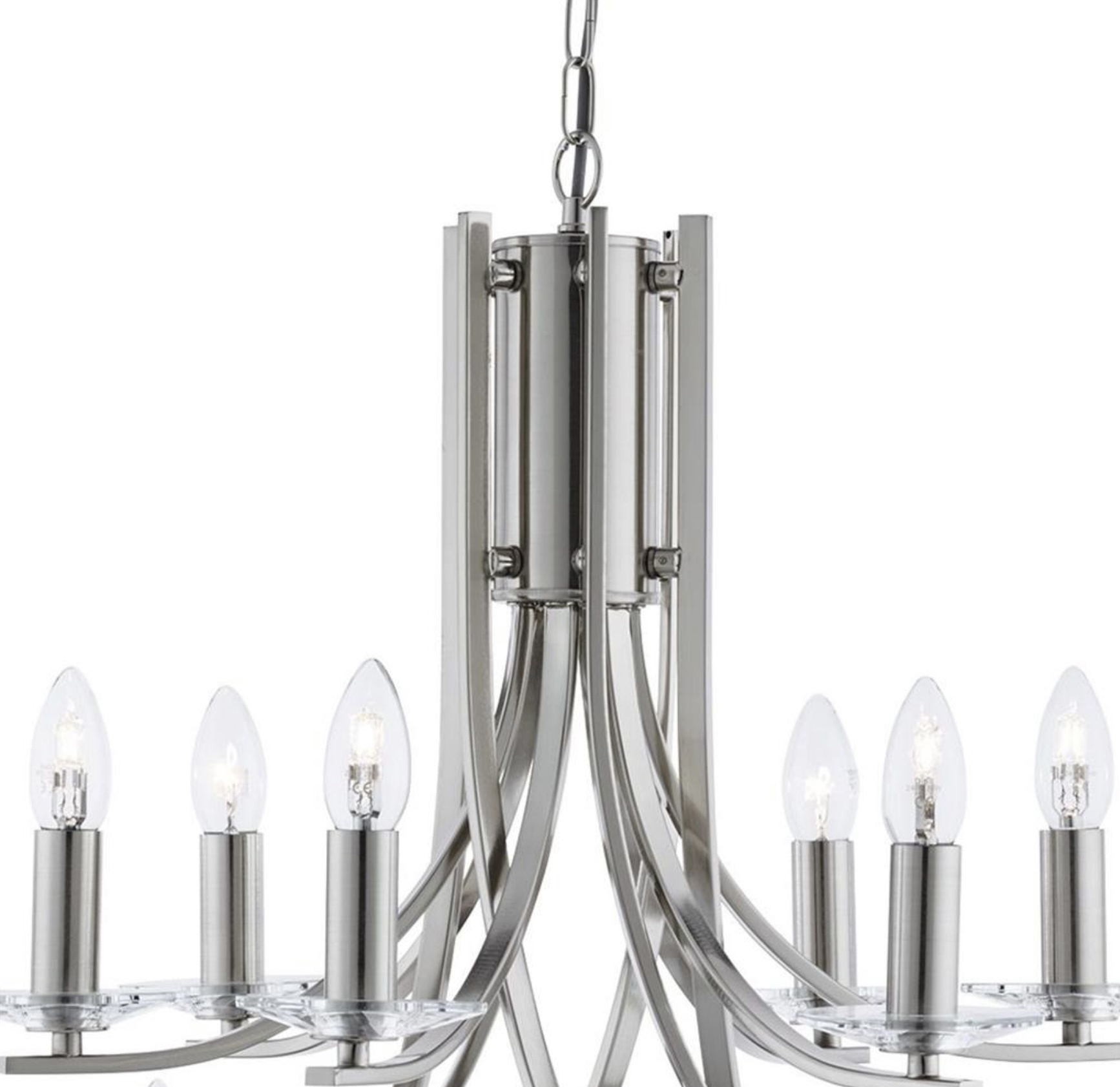 The Ascona chrome 12 light ceiling fitting with clear glass sconces is a traditional design with a modern finish. The satin chrome finish and intricate lighting features across two separate tiers, adding depth and detail to the fitting, and the twelve delicate glass sconces illuminate any room with style and sophistication.