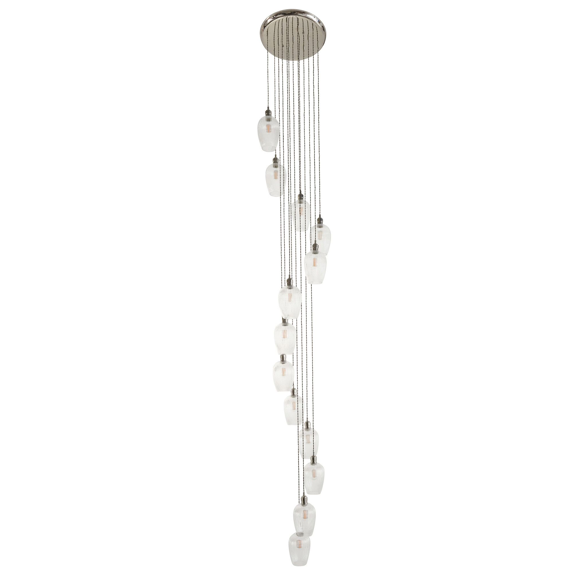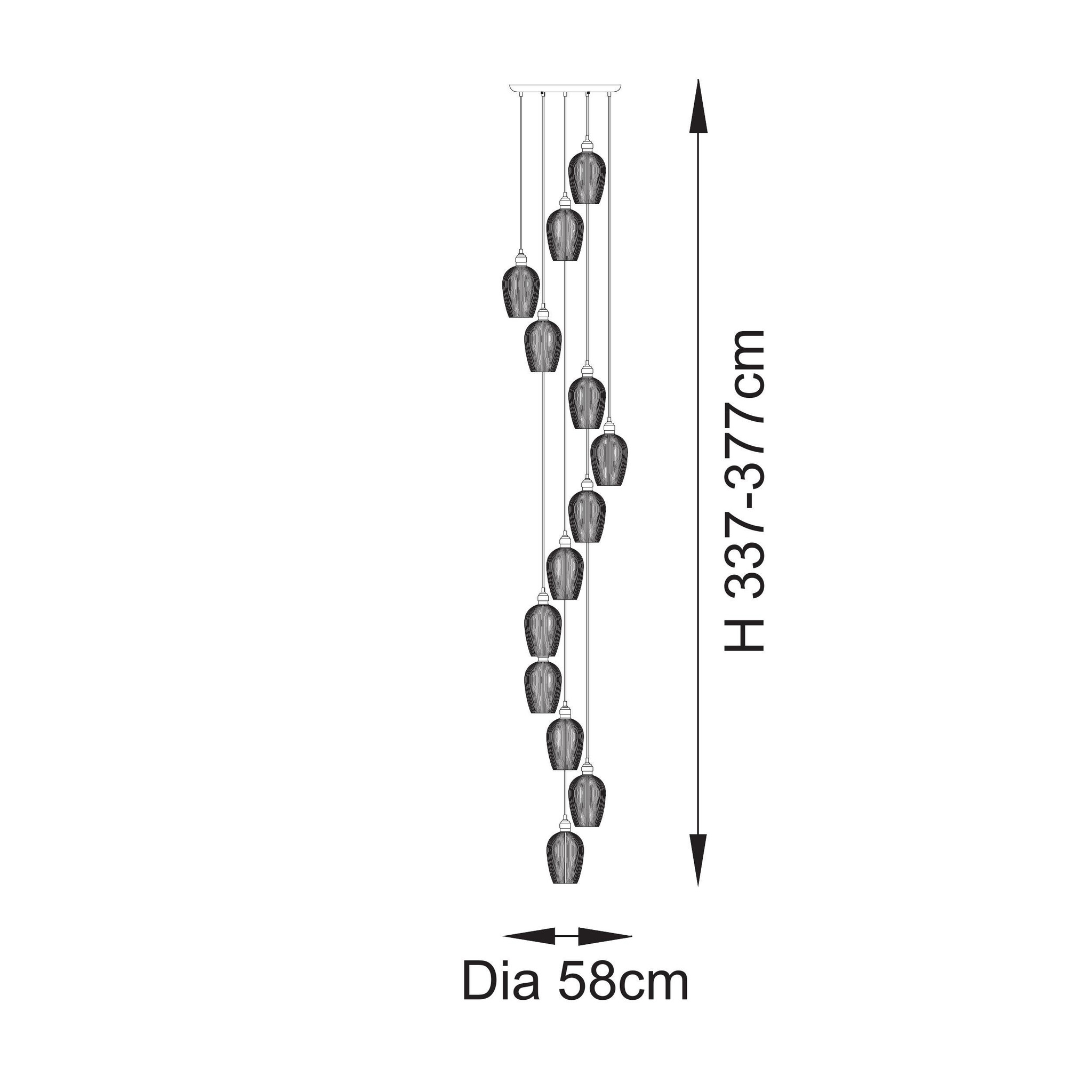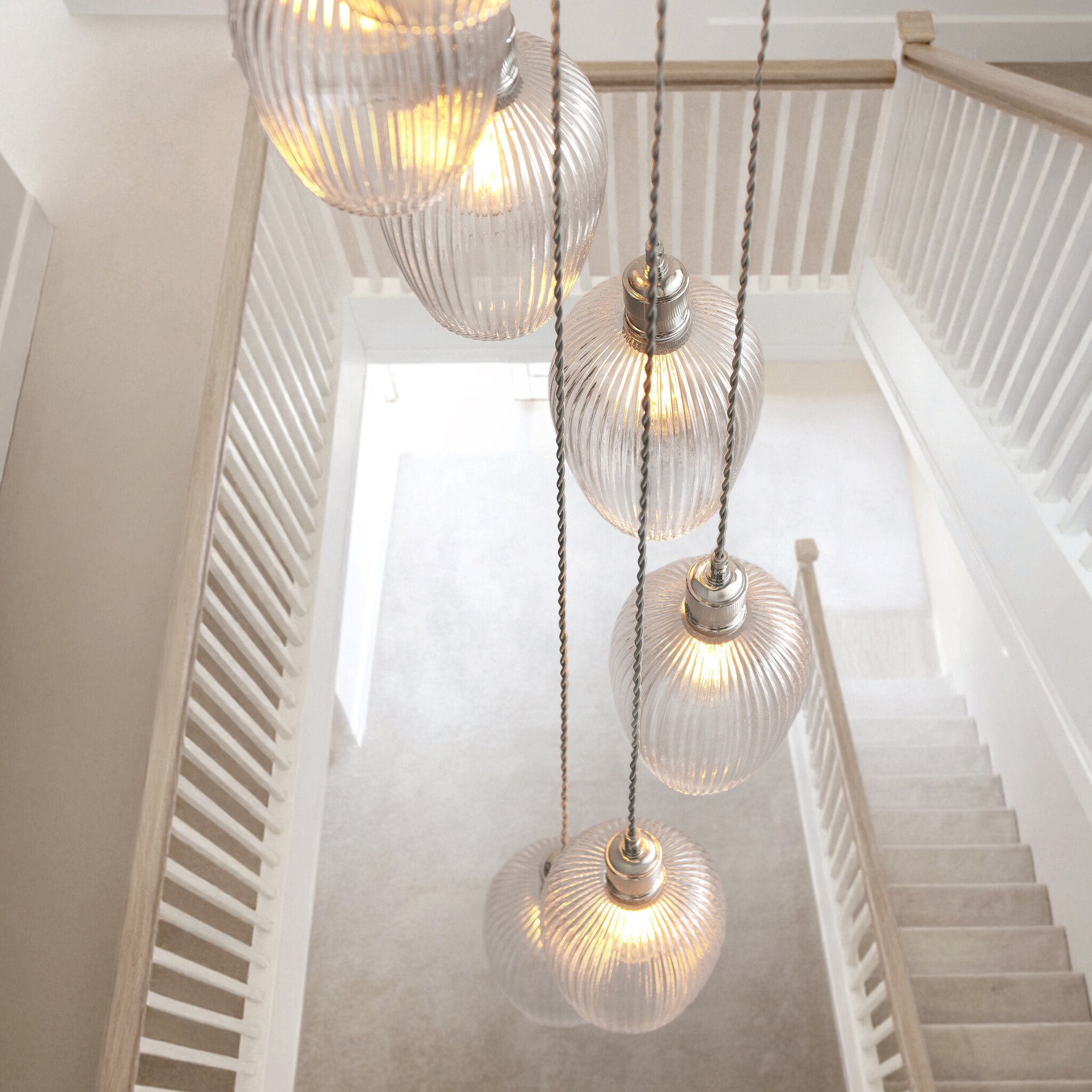 The Bettina 13 Light Cascading Staircase Chandelier comprises thirteen beautiful quality clear blown ribbed glass shades suspended at varying lengths on twisted grey fabric cables with antique brass metalwork to create a stunning feature piece.