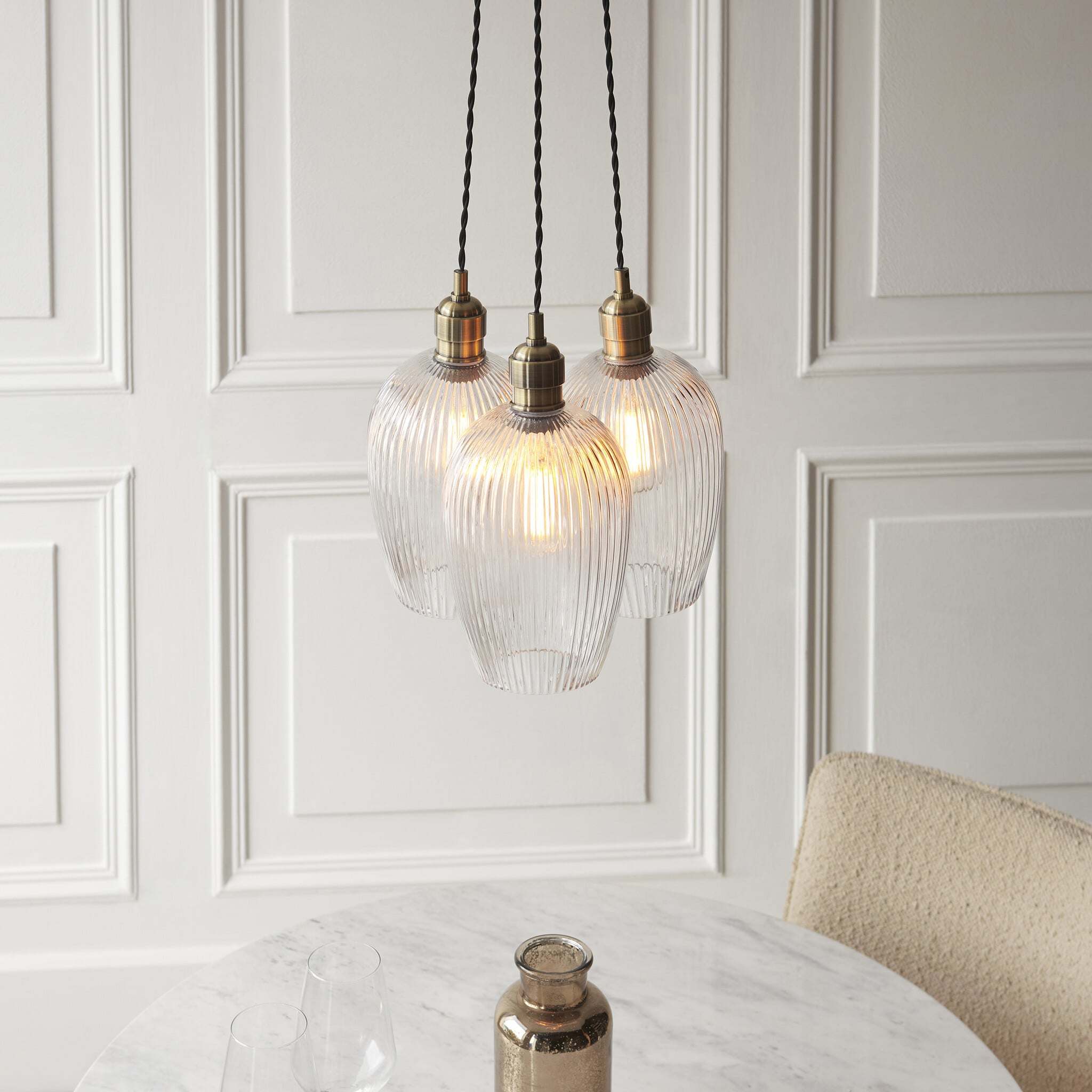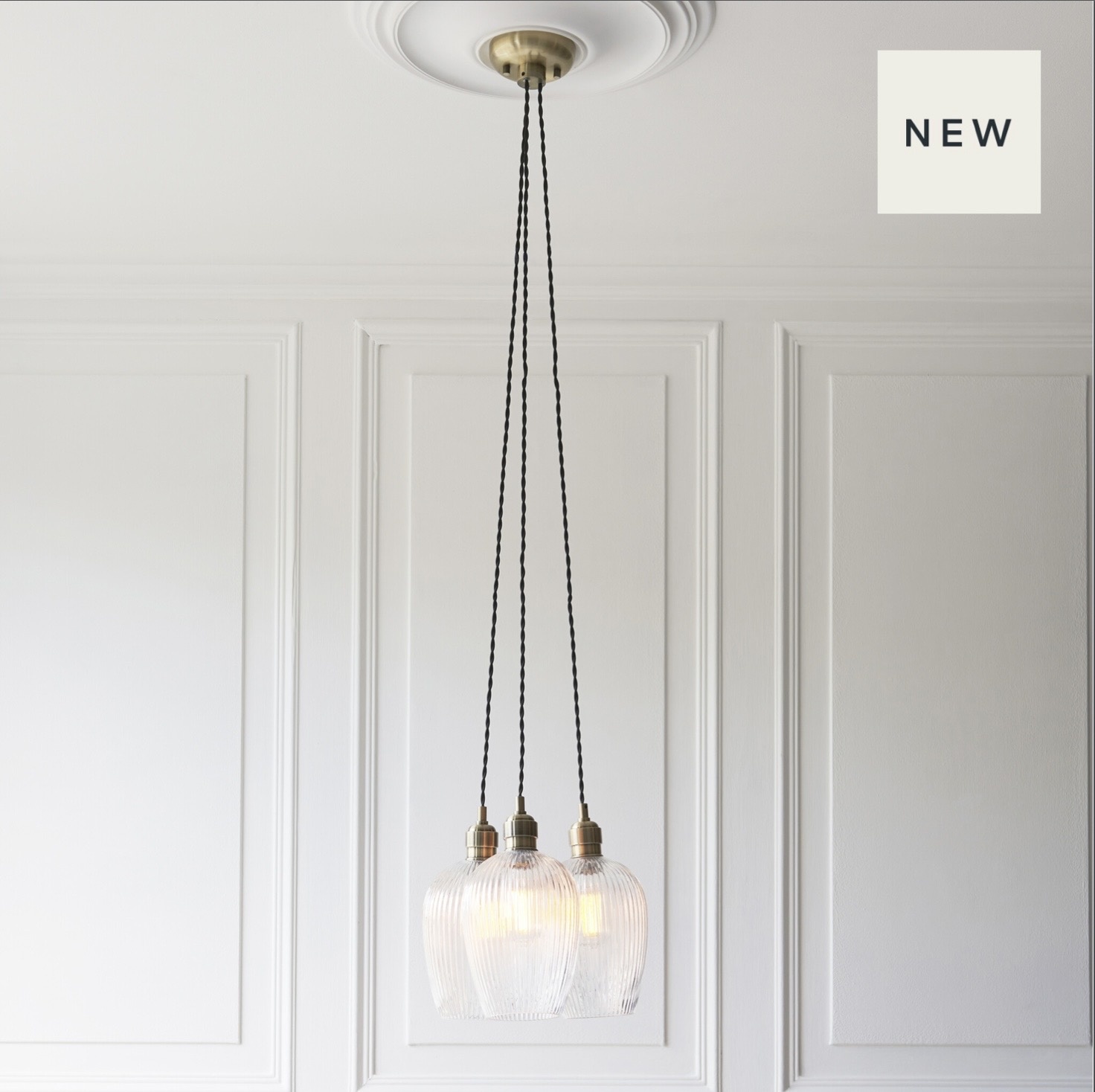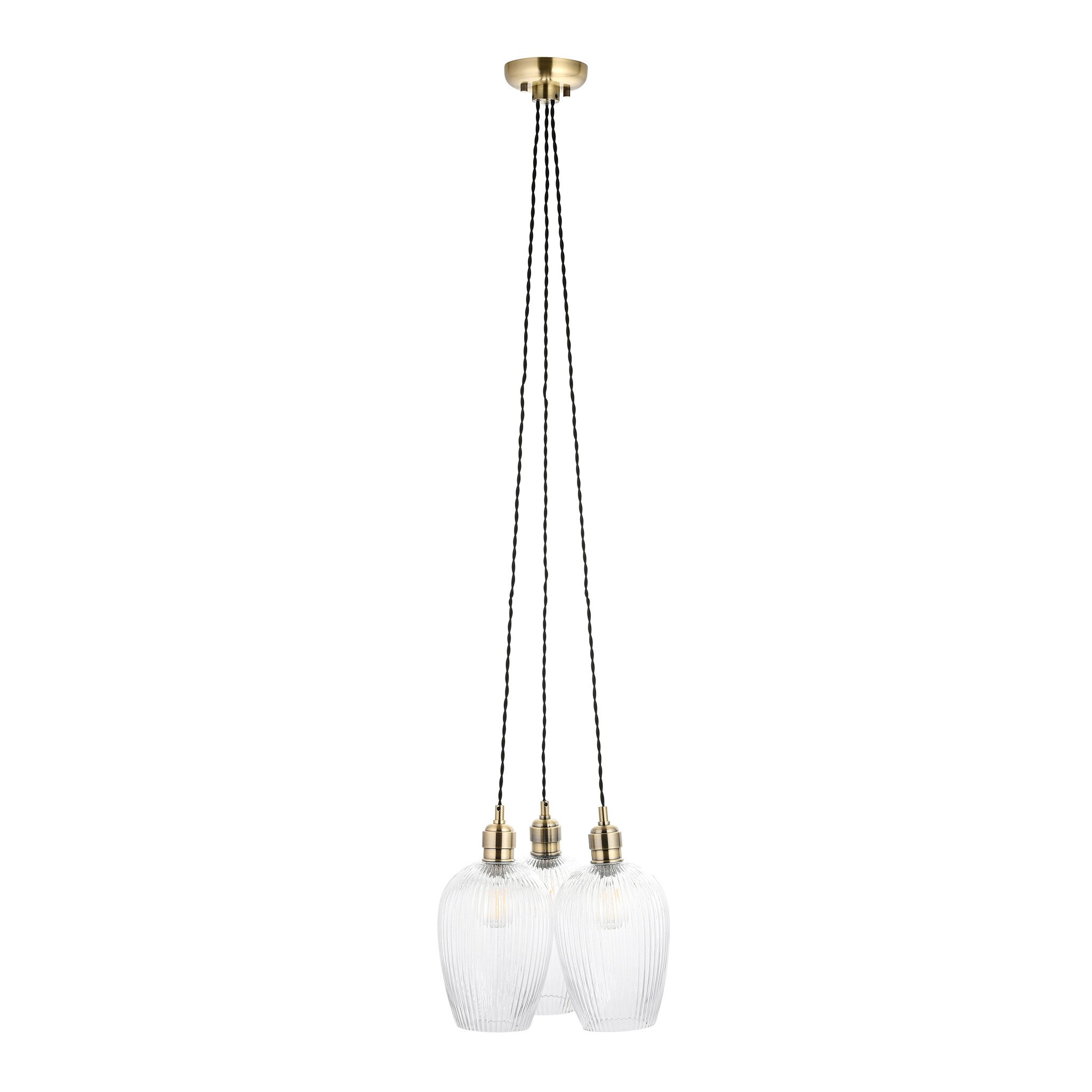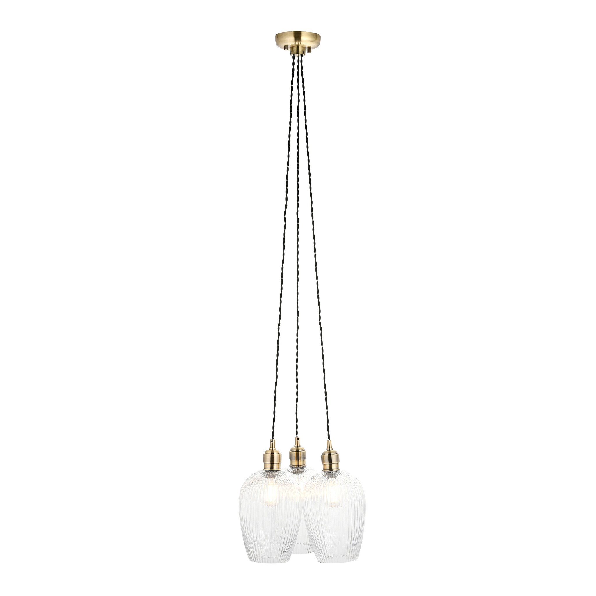 The Bettina 3 Light Cluster Light is a stylish pendant, comprising three top quality clear blown ribbed glass shades suspended from twisted grey fabric cables with antique brass metalwork.