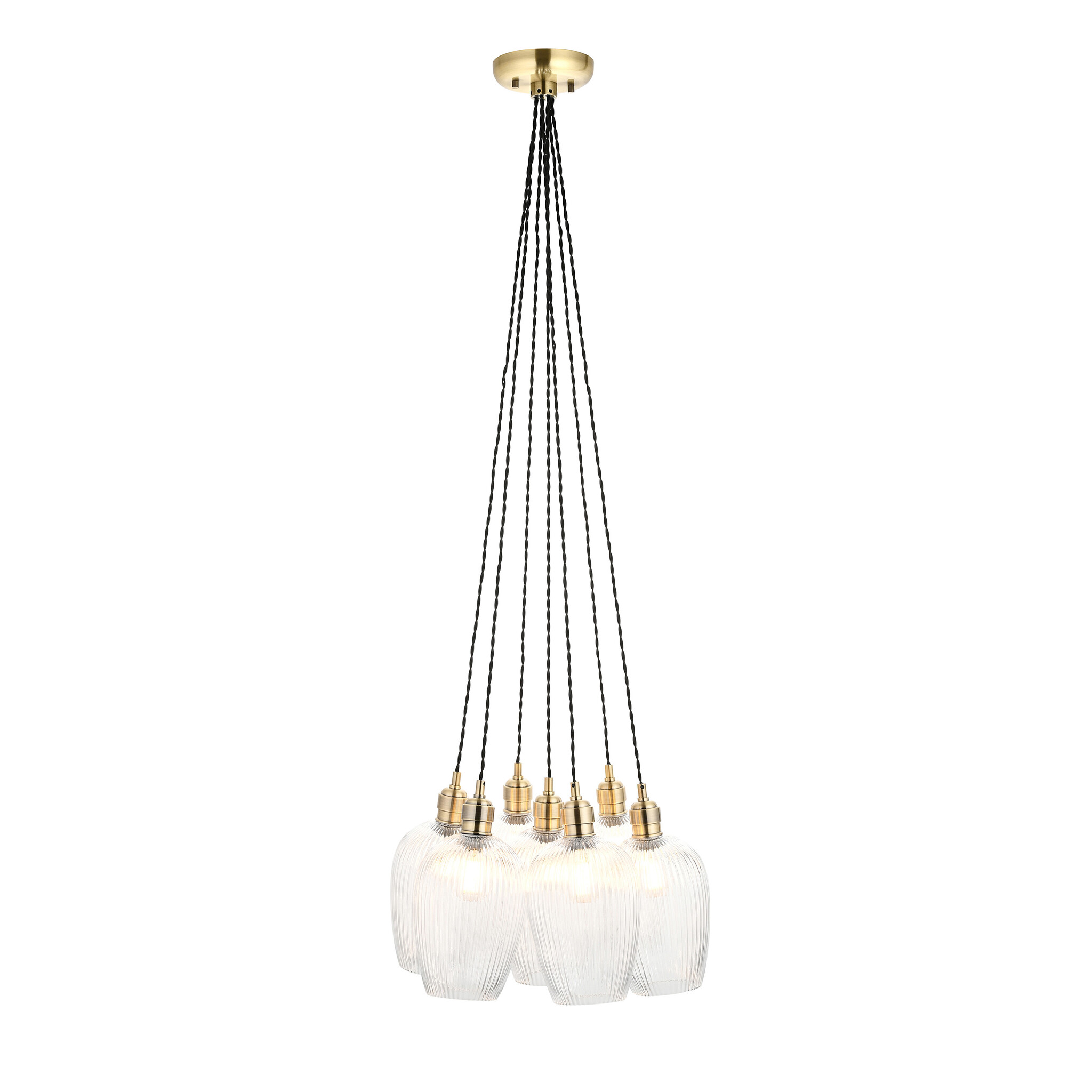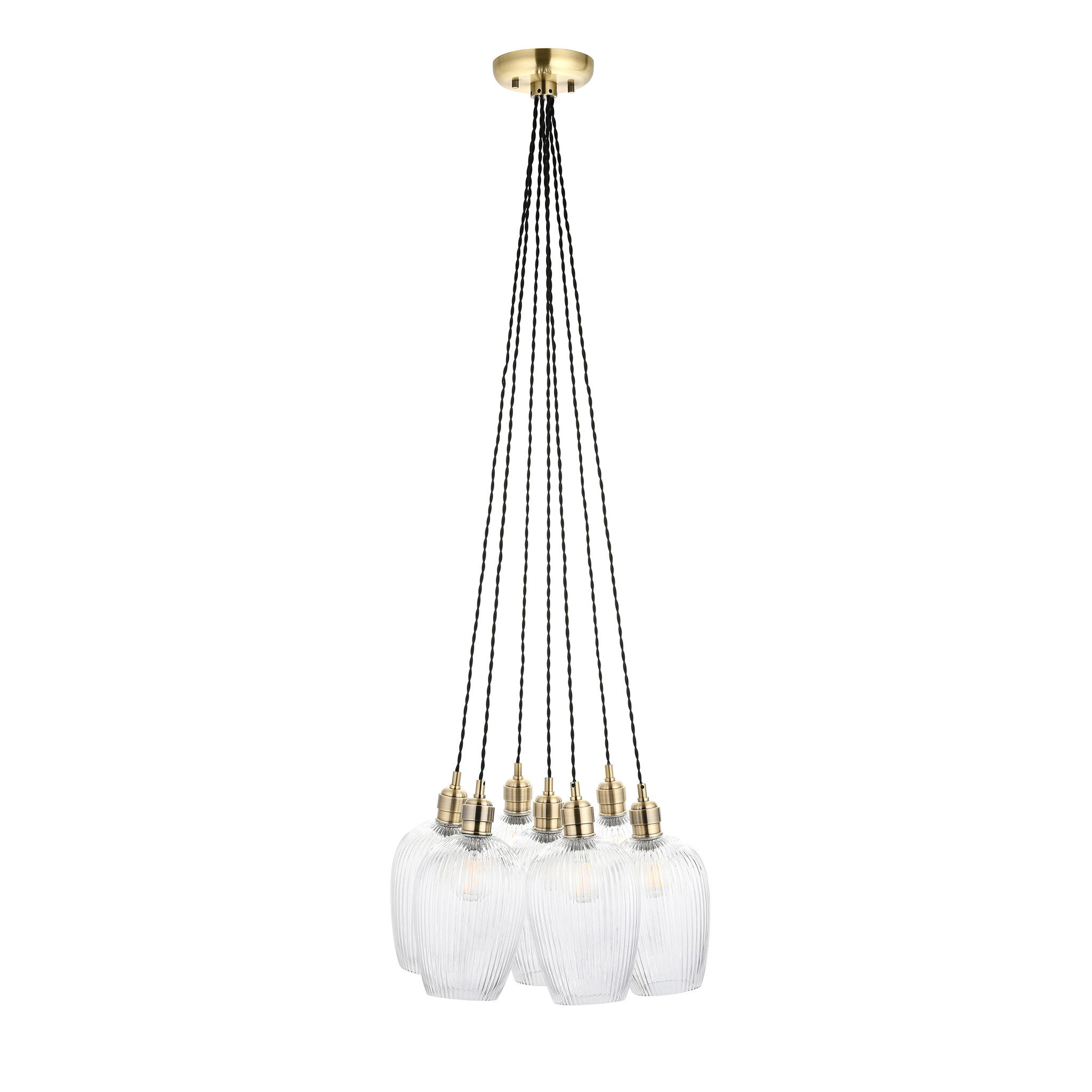 The Bettina 7 Light Cluster Light is a striking feature piece, comprising seven top quality clear blown ribbed glass shades suspended from twisted grey fabric cables with antique brass metalwork.