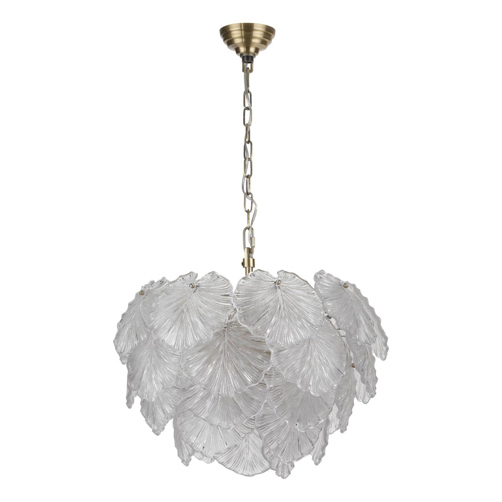 The Catrina 10 Light Pendant makes a stunning statement. Its antique brass frame embraces the textured glass leaves with the result being a warm, dappled glow.