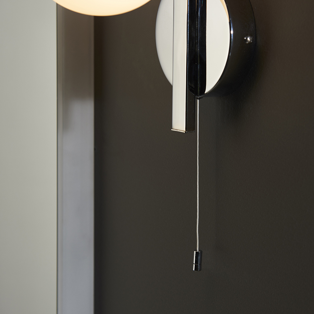 Polished chrome plated metalwork marry beautifully against the curve of the matt opal sphere glass shade to create this wonderful wall light. Easy to reach on/off cord and the Cowling wall light is also IP44 rated as being safe to use in the bathroom.