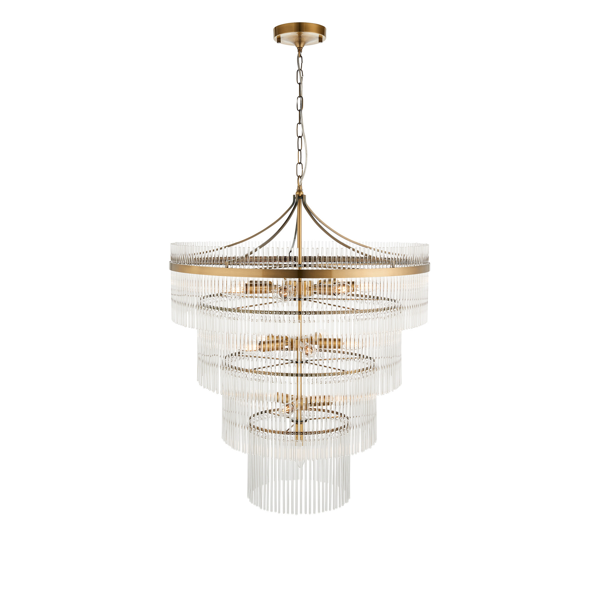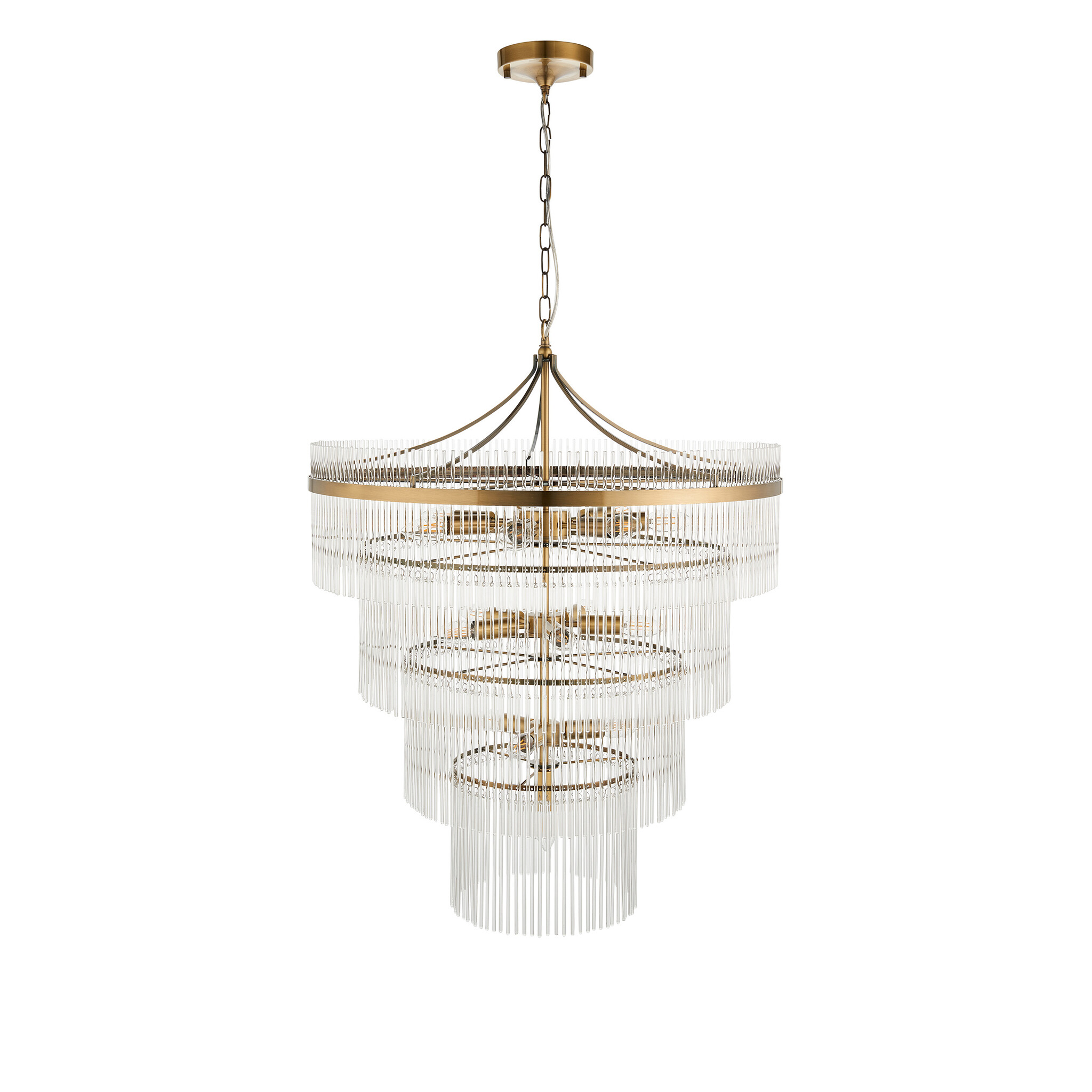 Create an impressive statement with this large 16 light tiered glass pendant. Perfect for stairwells and high ceiling interiors. Finished in Antique Brass and decorated with clear glass rods that delicately diffuse the light,creating that classic iconic look.