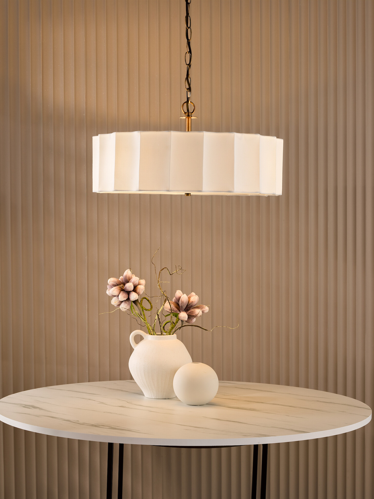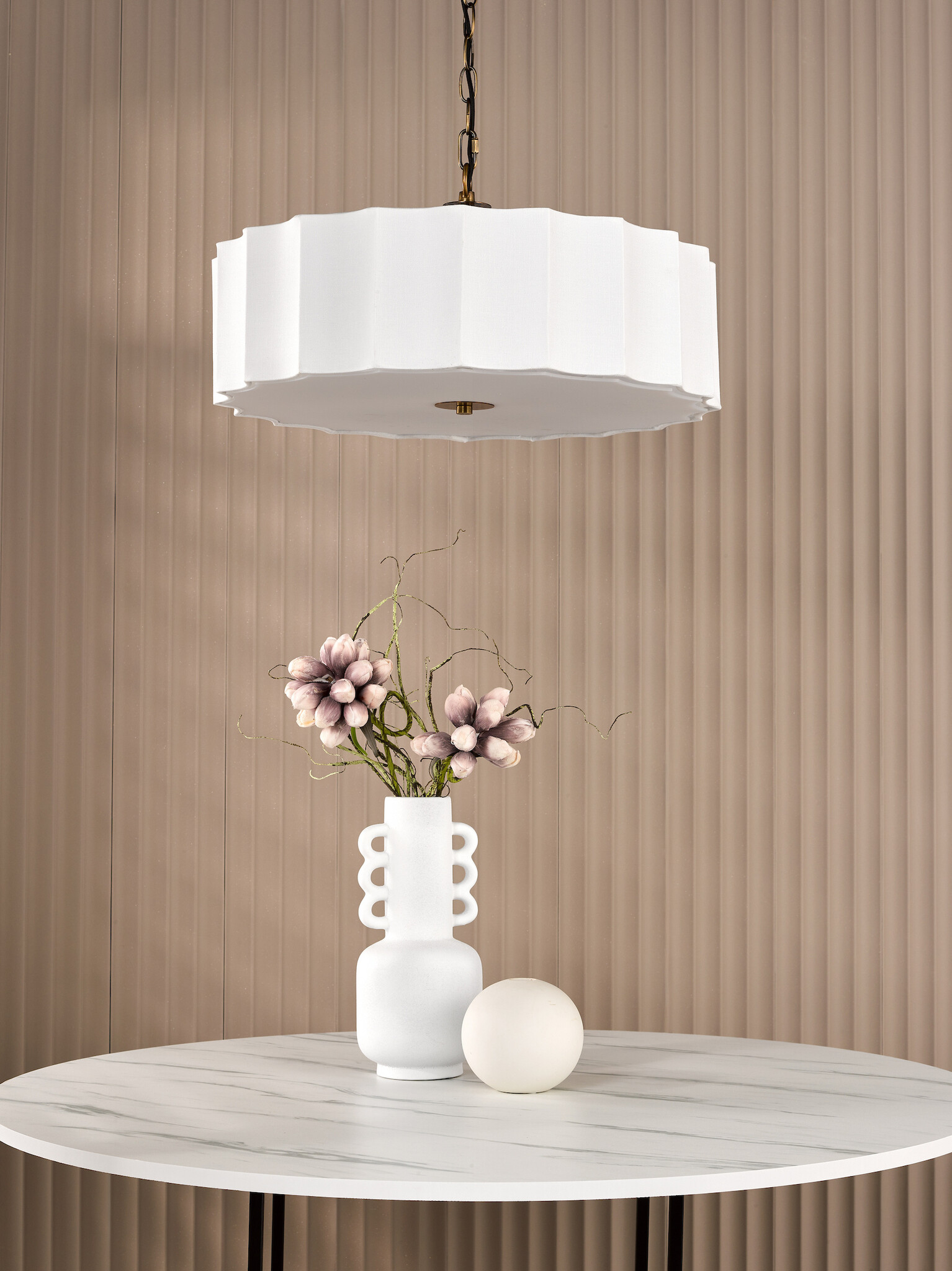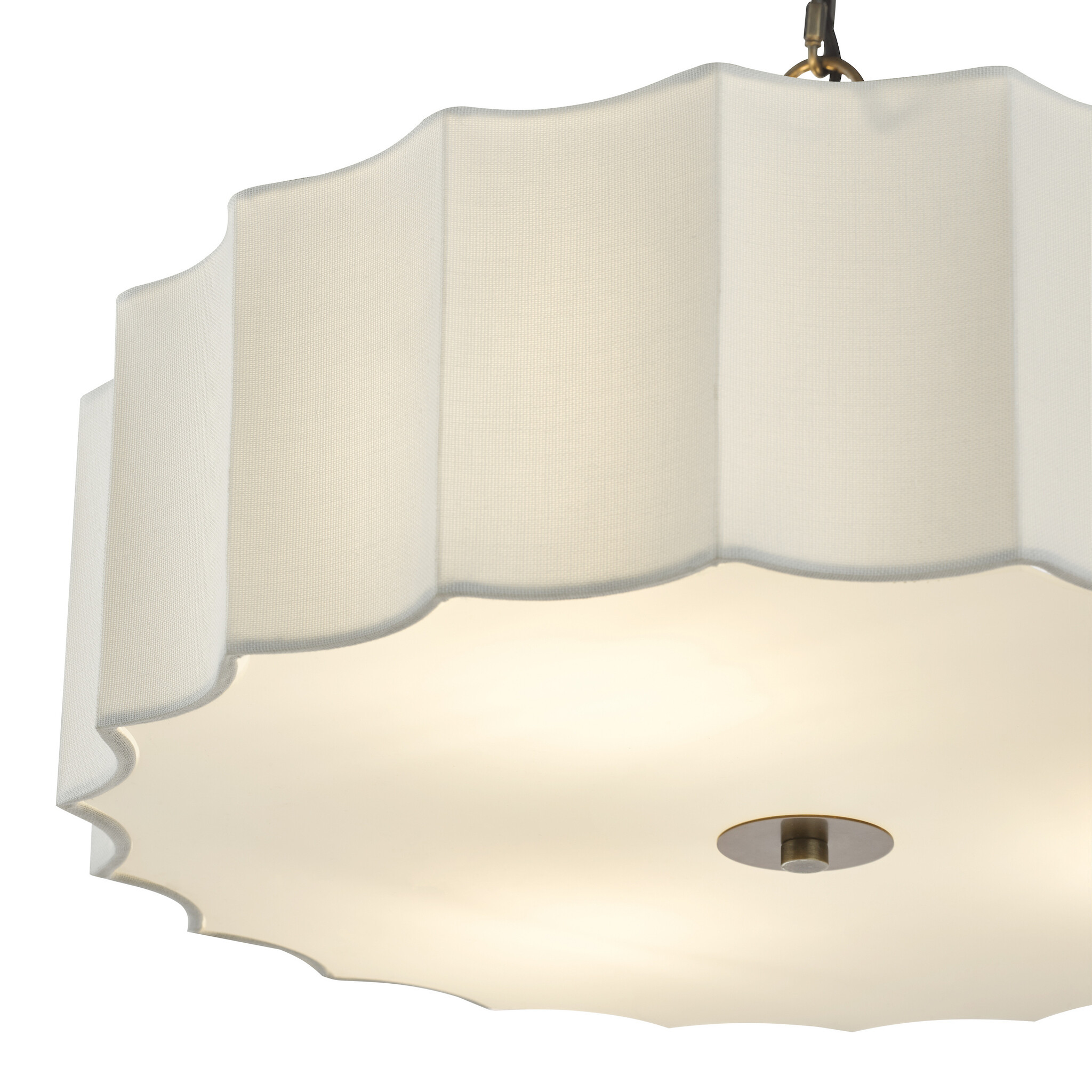 The Drift Scalloped Minimalist Pendant Light blends contemporary minimalism with soft neutral tones, making it a versatile choice for both modern and transitional interiors. At 50cm wide, its ivory linen shade features smooth, scalloped waves paired with an opaque acrylic diffuser and antique bronze finial for a refined finish.
