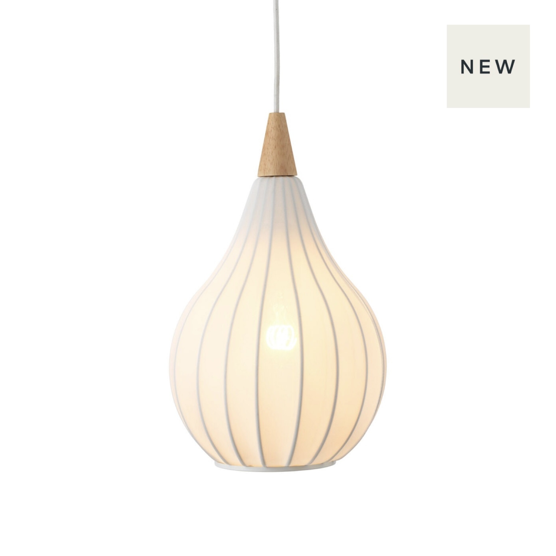 Crafted from natural oiled wood with white fabric stretched over the metal teardrop frame, these pendant lights emit a soft, ambient glow that brings warmth and subtle sophistication to any space.