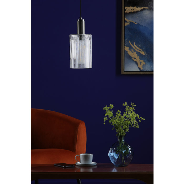 Delightfully stylish, this ribbed cylinder glass and polished nickel pendant light is in the refined industrial style. The lamp holder is heavy machine finished, giving a pleasing chunky effect in a polished nickel, ideal against the ribbed cylinder glass shade. This pendant is height adjustable in installation and is a perfect kitchen/diner lighting solution.