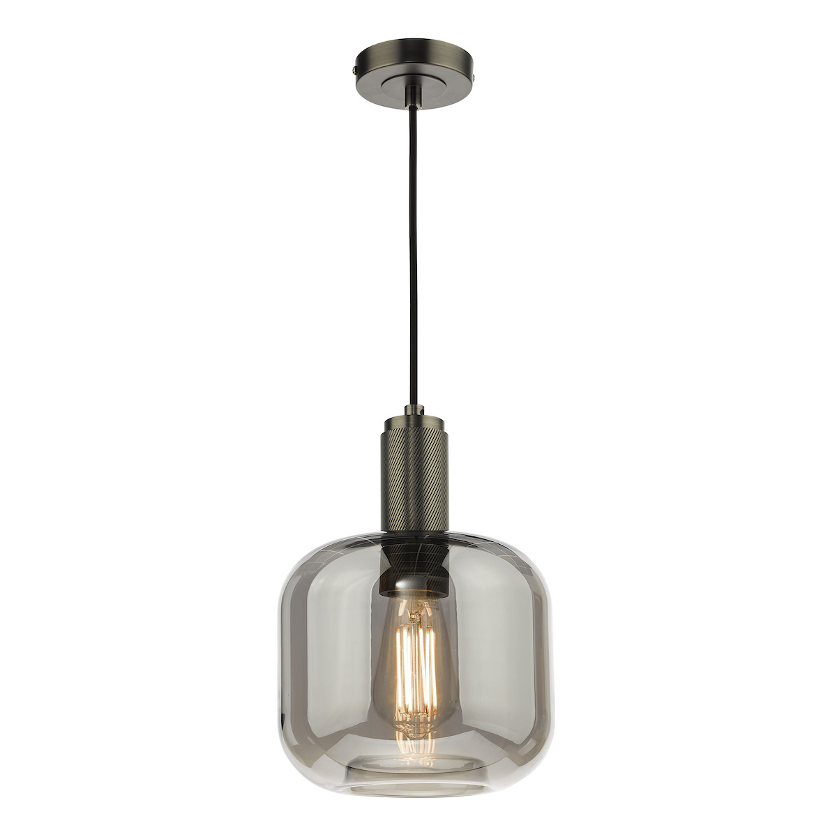 Delightfully stylish, this smoked glass and polished nickel pendant light is in the refined industrial style. The lamp holder is heavy machine finished, giving a pleasing chunky effect in polished nickel, ideal against the smoked glass shade. This pendant is height adjustable in installation and is a perfect kitchen/diner lighting solution.