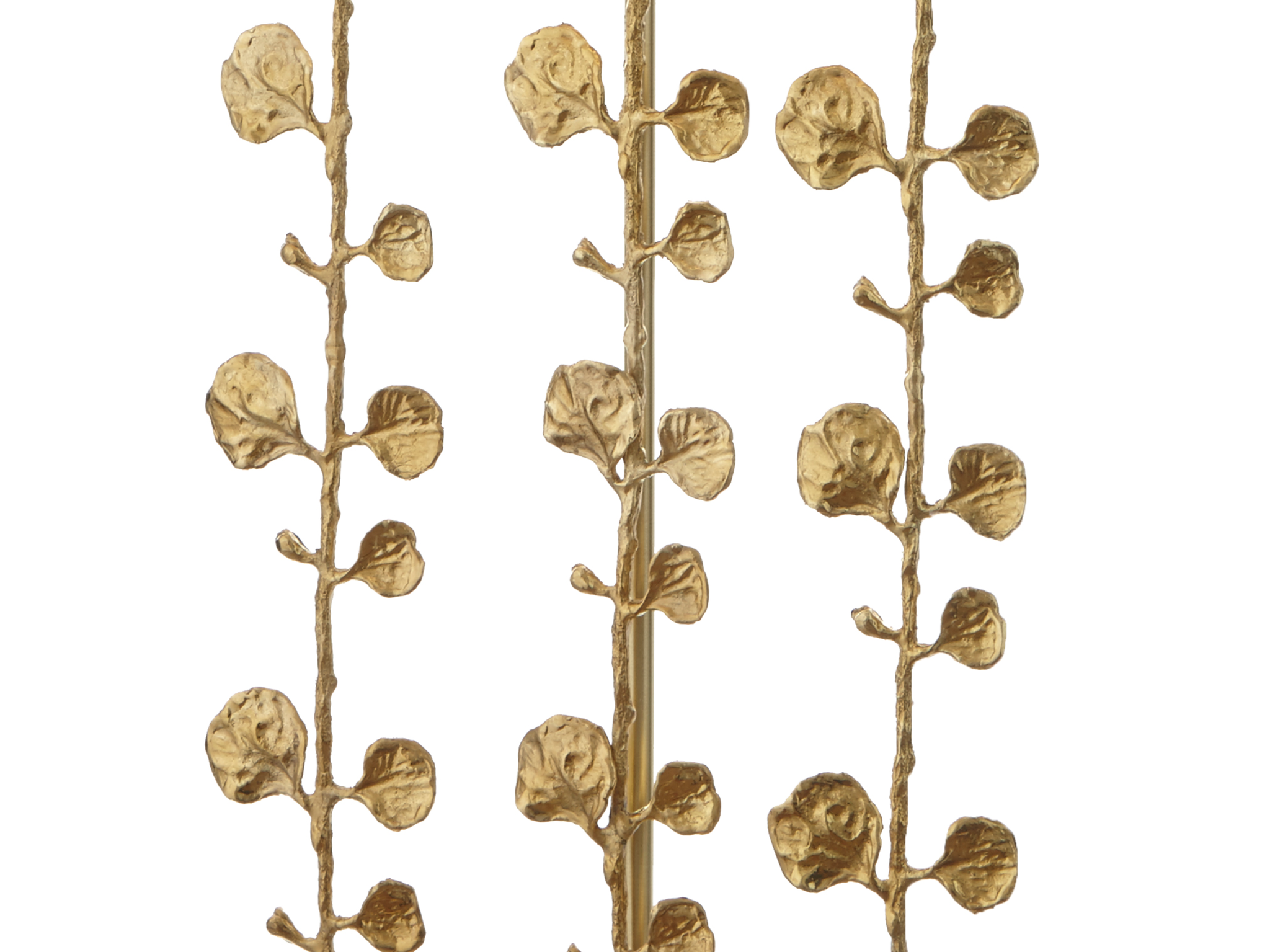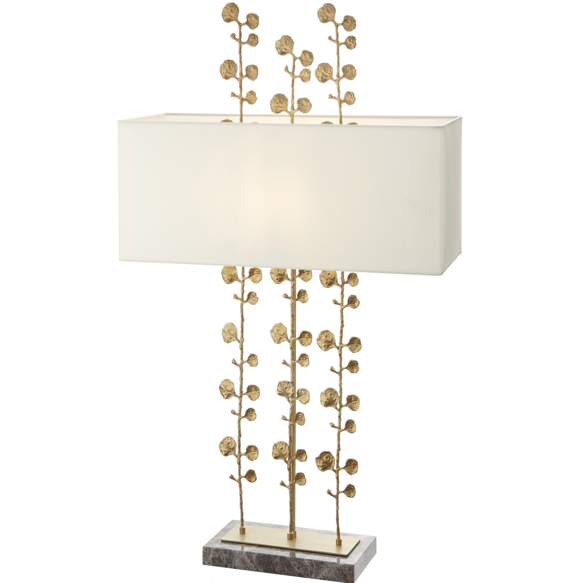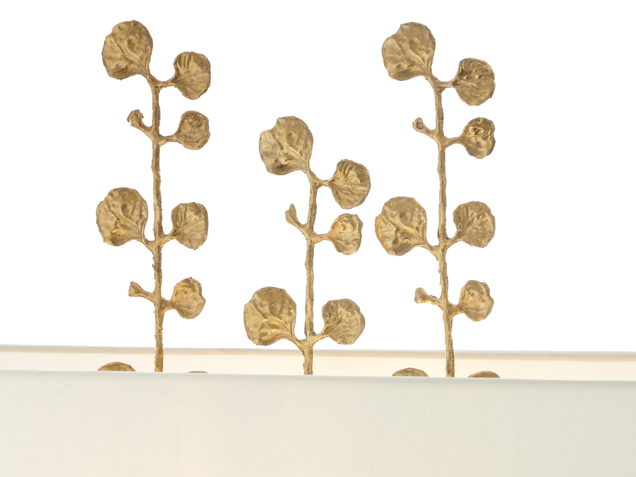 Three stylised eucalyptus stems climb up and through the centre of a minimalist, cream rectangular shade.