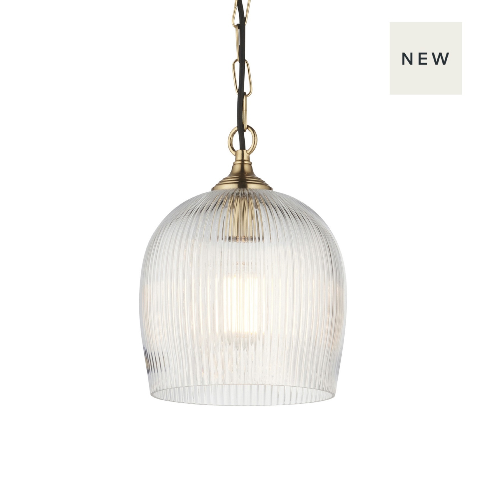 Refined and versatile, this glass pendant light in a warm brass finish, features a clear ribbed glass dome shade, suspended from a height-adjustable chain and black braided flex for a vintage-inspired touch.