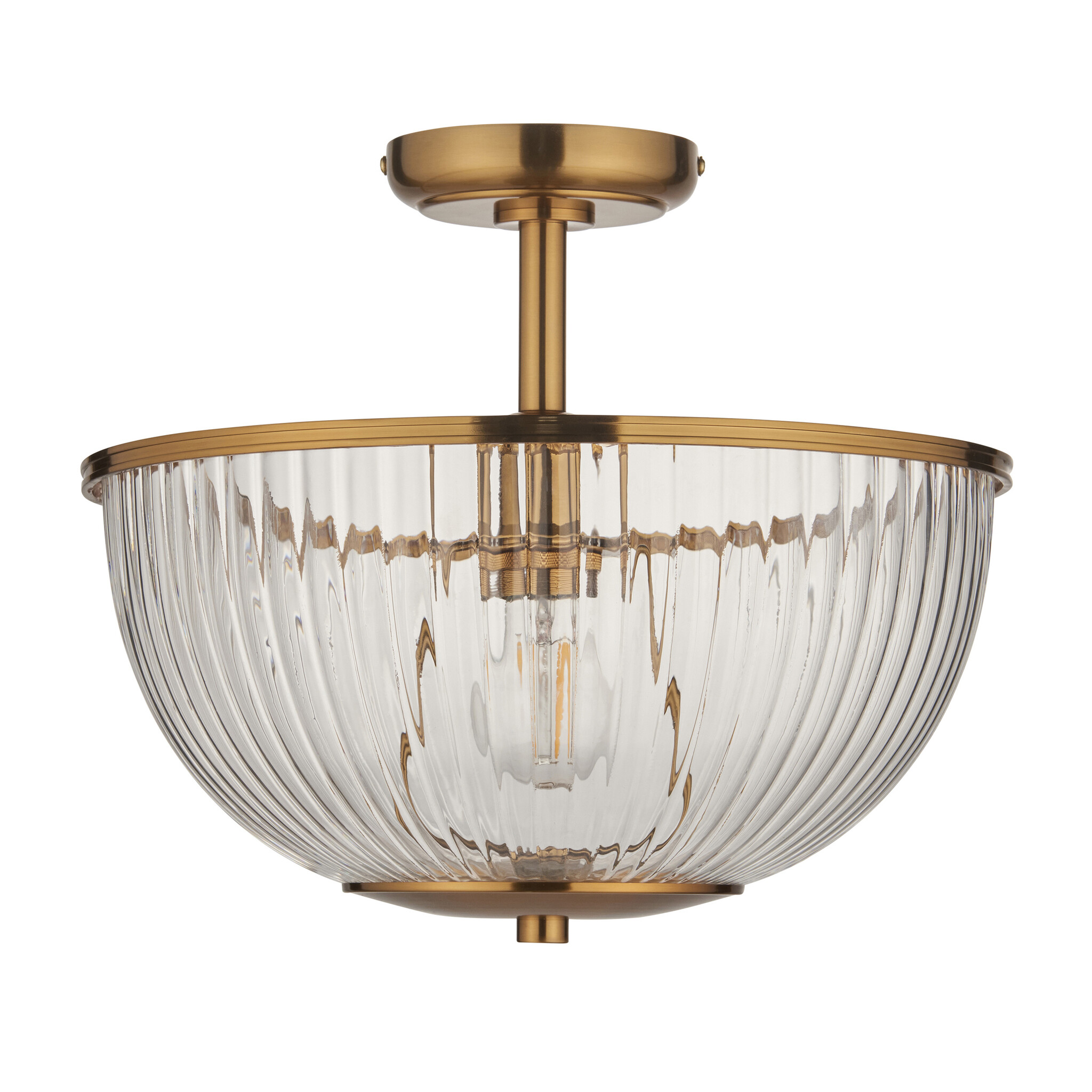 Featuring a ribbed dome-shaped clear glass shade, it casts a soft, diffused glow that adds warmth and character to any interior. The vintage brass finish metalwork and subtle detailing introduce a timeless sophistication, making Ferna an ideal choice for hallway ceiling lights, kitchens, or bedrooms.