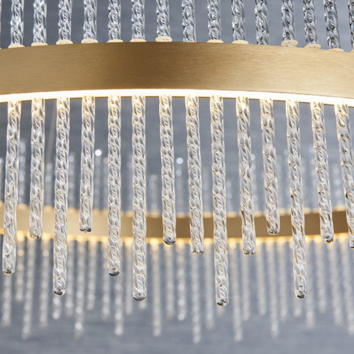 A modern statement piece - the Filey range of feature pendant lights feature a slimline brushed gold plated ring which is intersected by hundreds of twisted clear glass rods. The hidden integrated LED lights elegantly light the clear glass rods for a beautiful decorative lighting effect.
