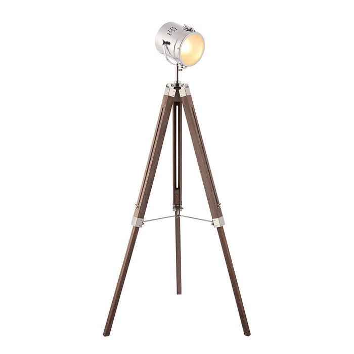 An on-trend 'photographers studio' style floor lamp, cool tripod design constructed from wood with chrome plated details and on/off foot switch. Fully adjustable to direct the light to where the action is for that film studio look.