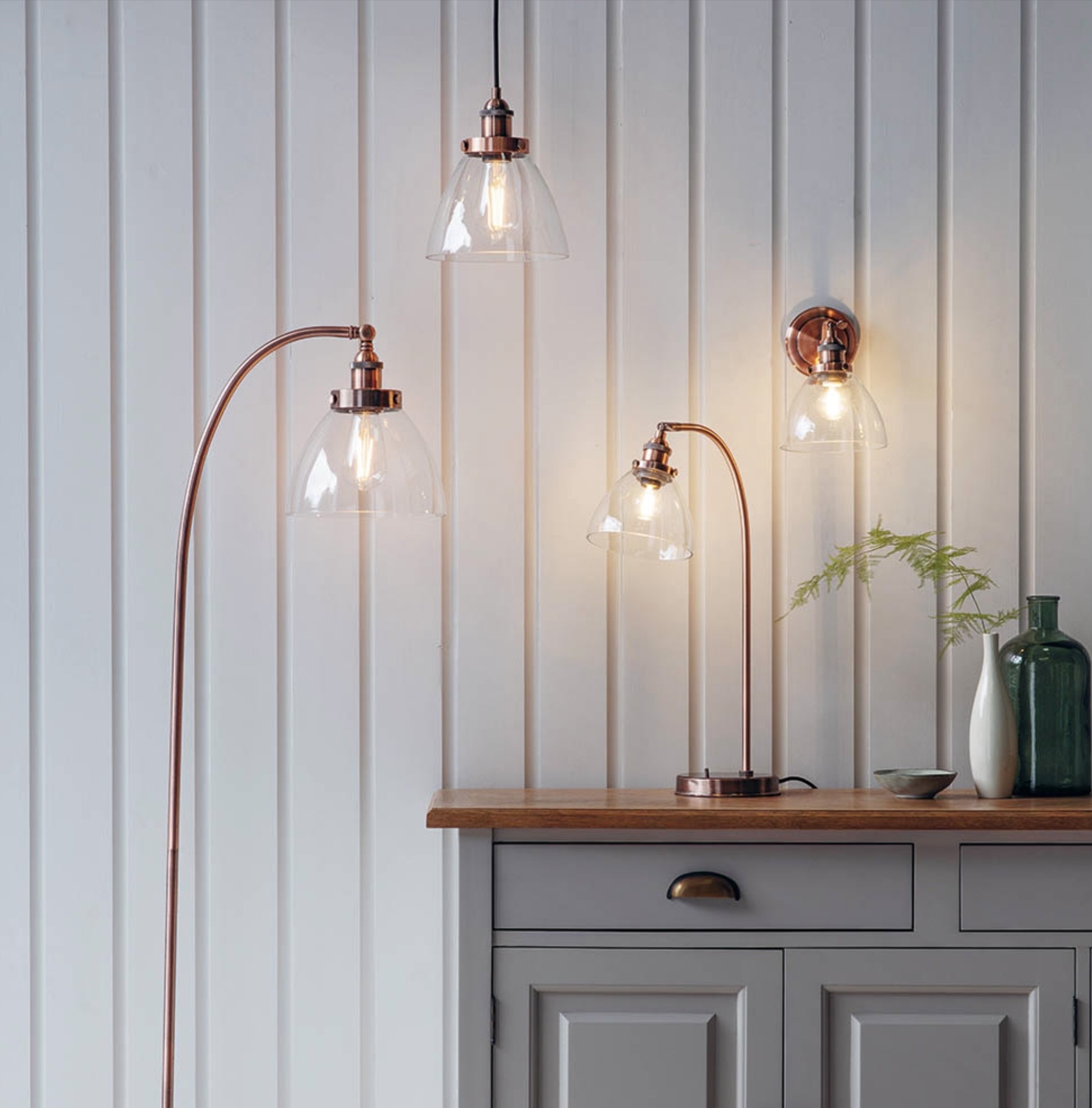 Available in brushed copper, antique brass and satin silver, the Resto works equally well hung as a single statement in a hallway or grouped in pairs or threes above a run of kitchen units or a long dining table. The height-adjustable flex means it can be tailored precisely to your space.
