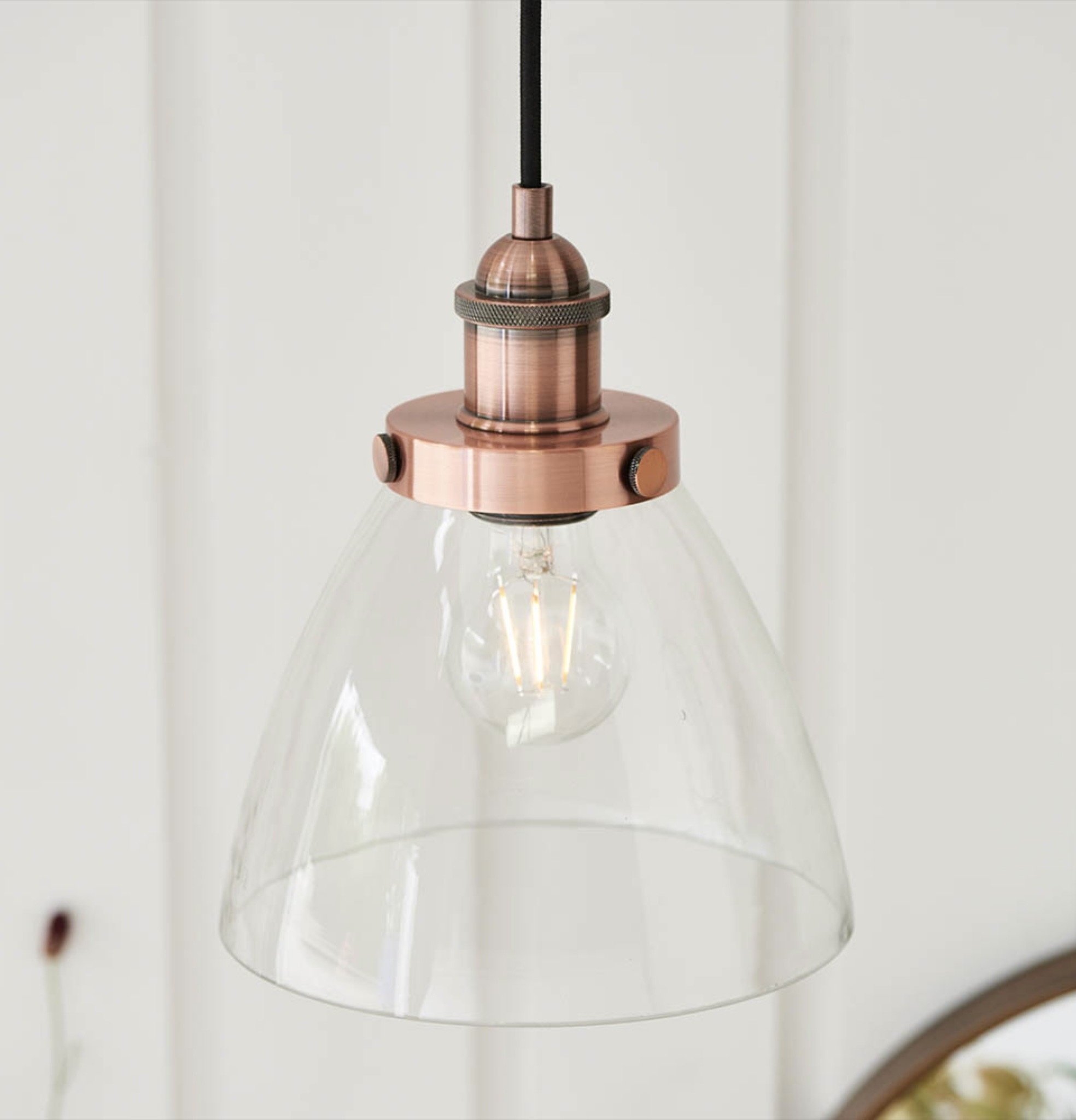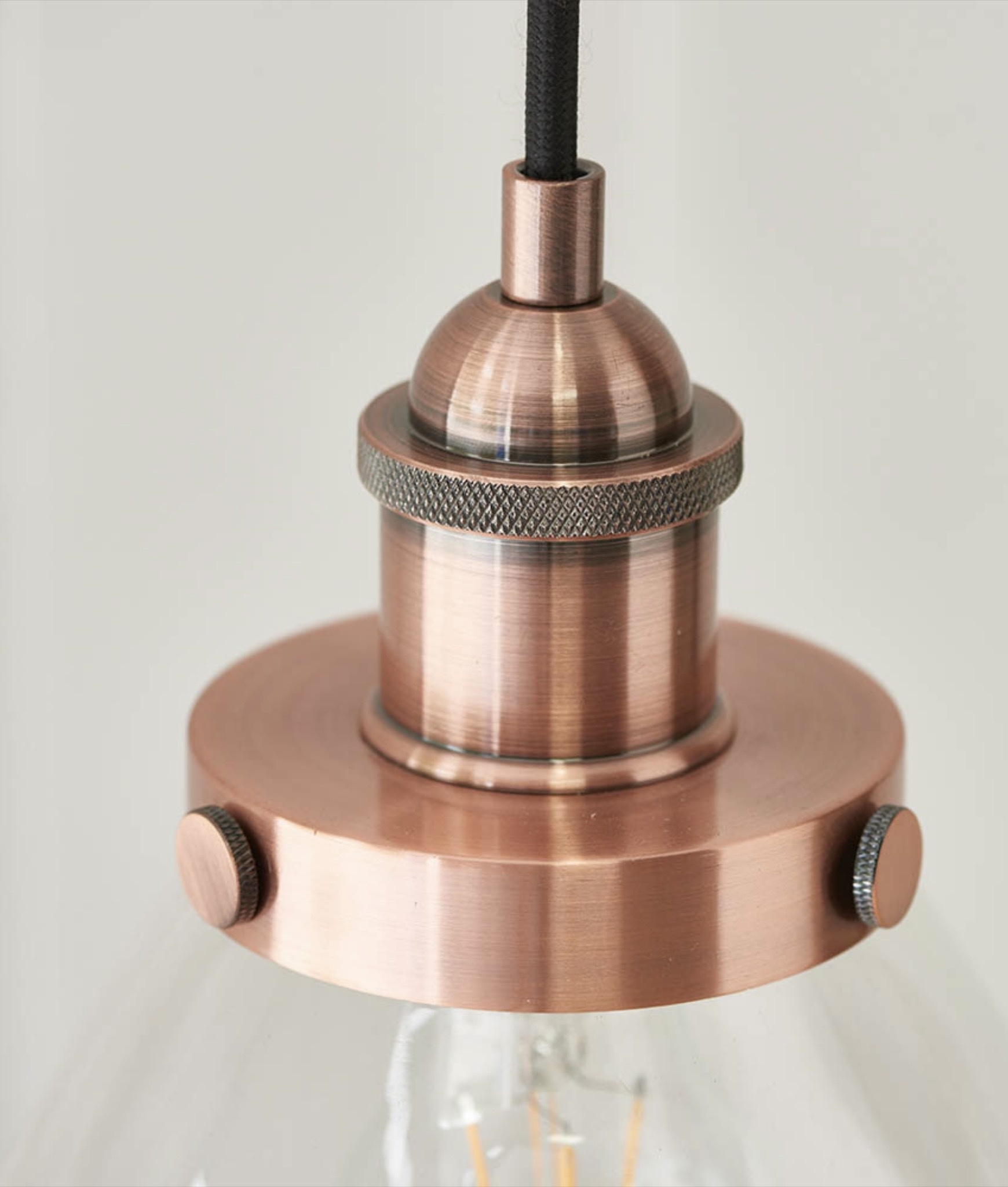 The Resto is a pendant that knows exactly what it is — and does it exceptionally well. Its clear glass dome shade sits beneath brushed copper metalwork finished with authentic knurled detailing, suspended on a height-adjustable black fabric flex that adds a further layer of considered craft.