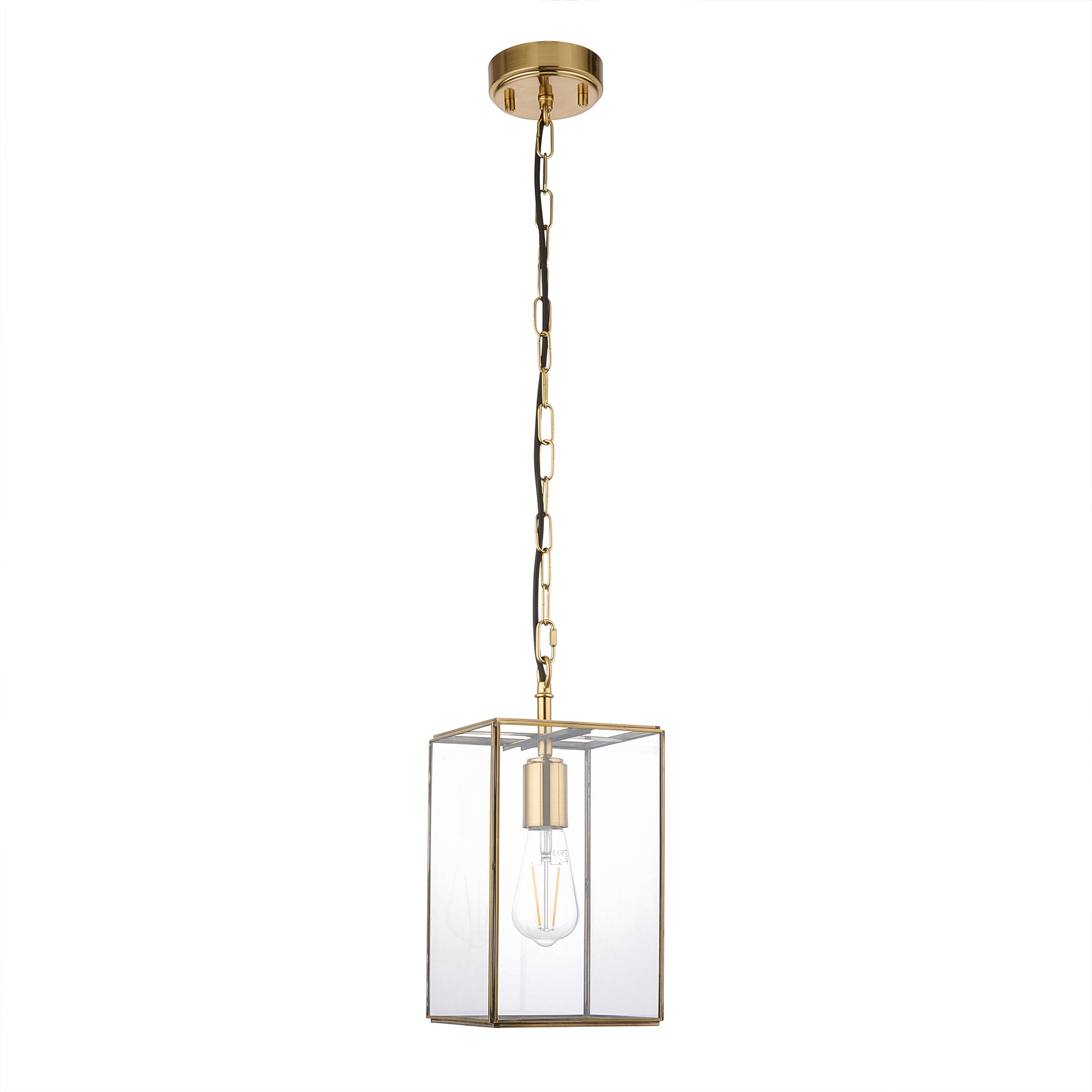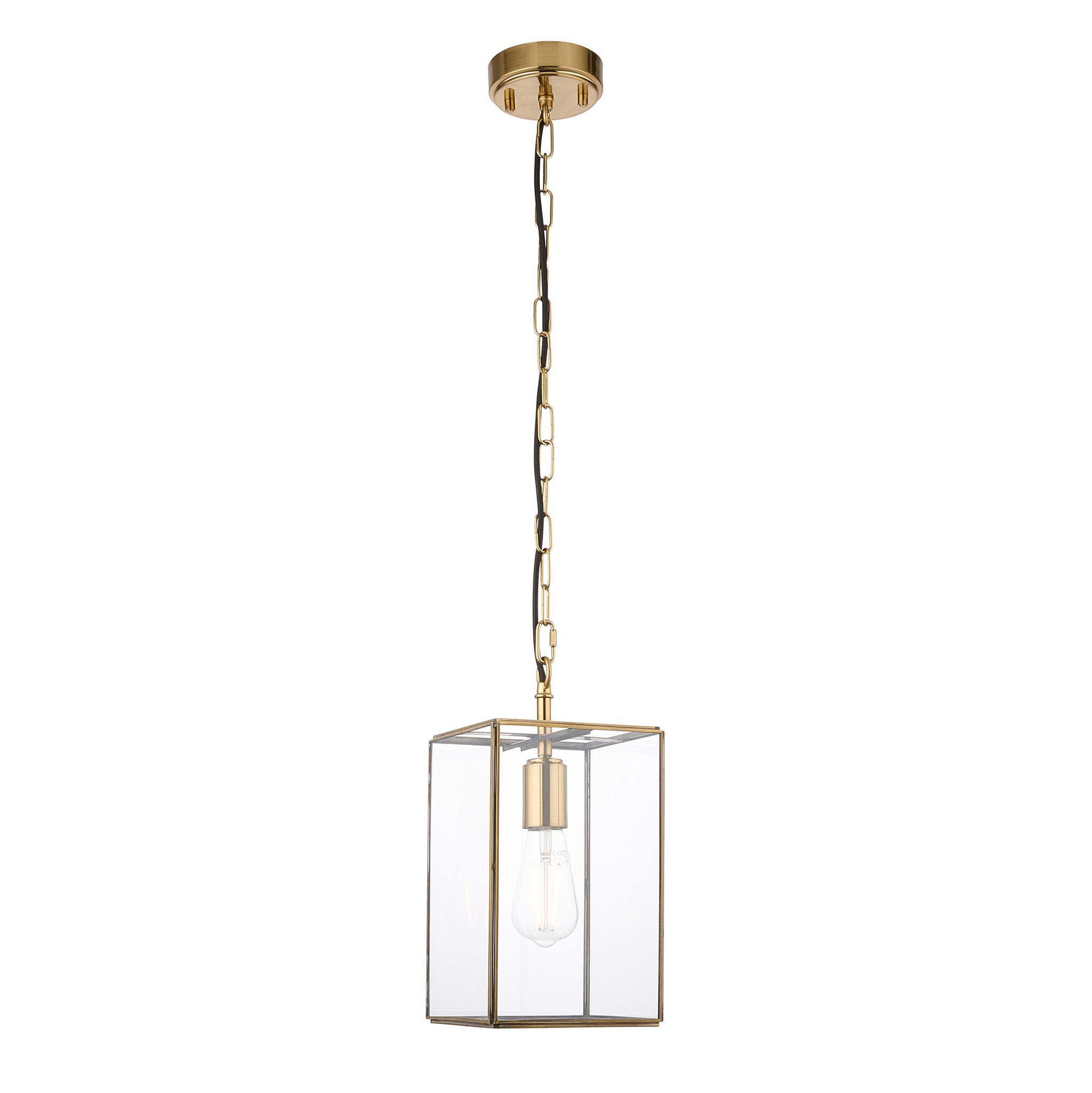 This pendant showcases timeless styling with brushed aged brass metalwork and clear glass panels for a refined, classic look.