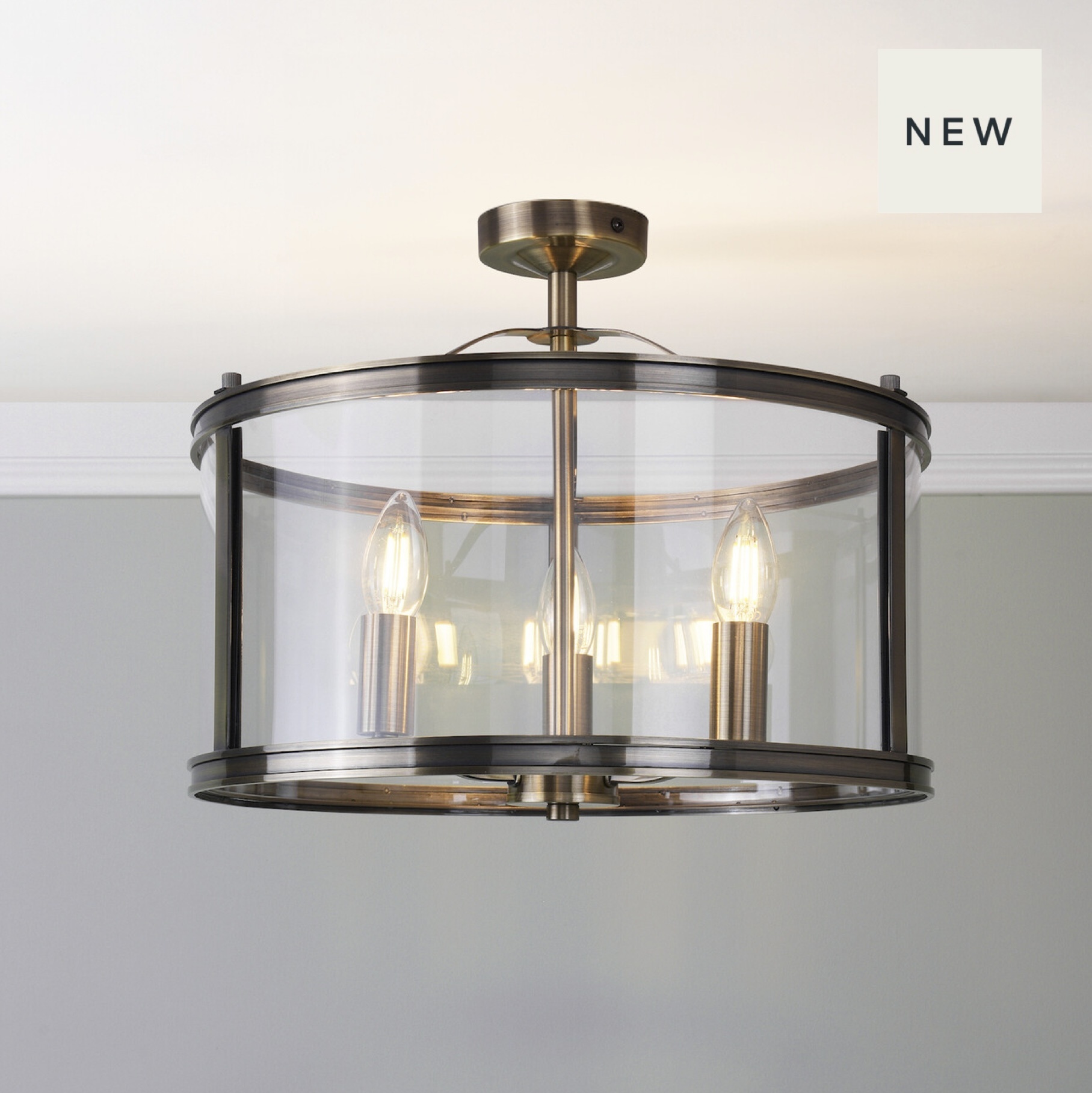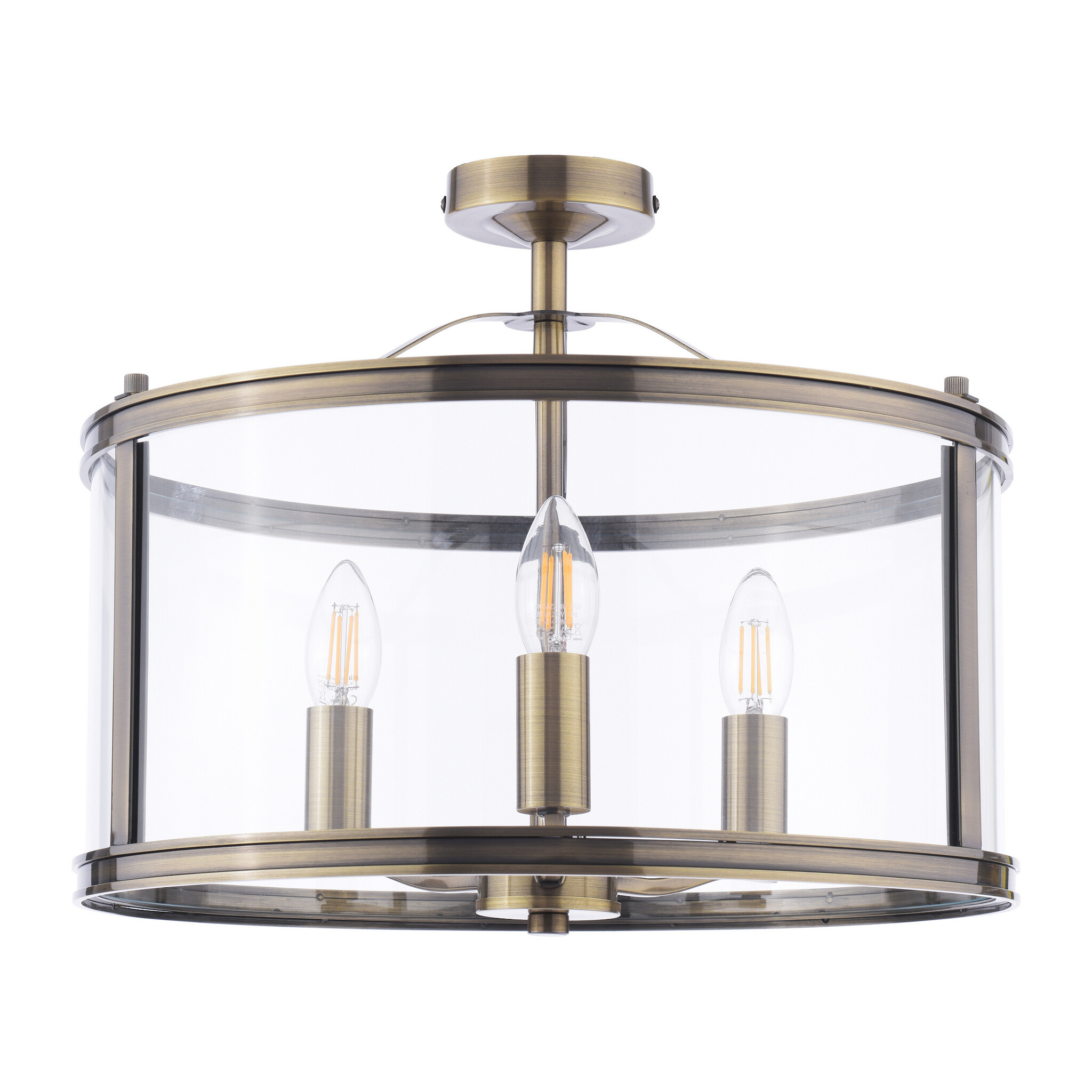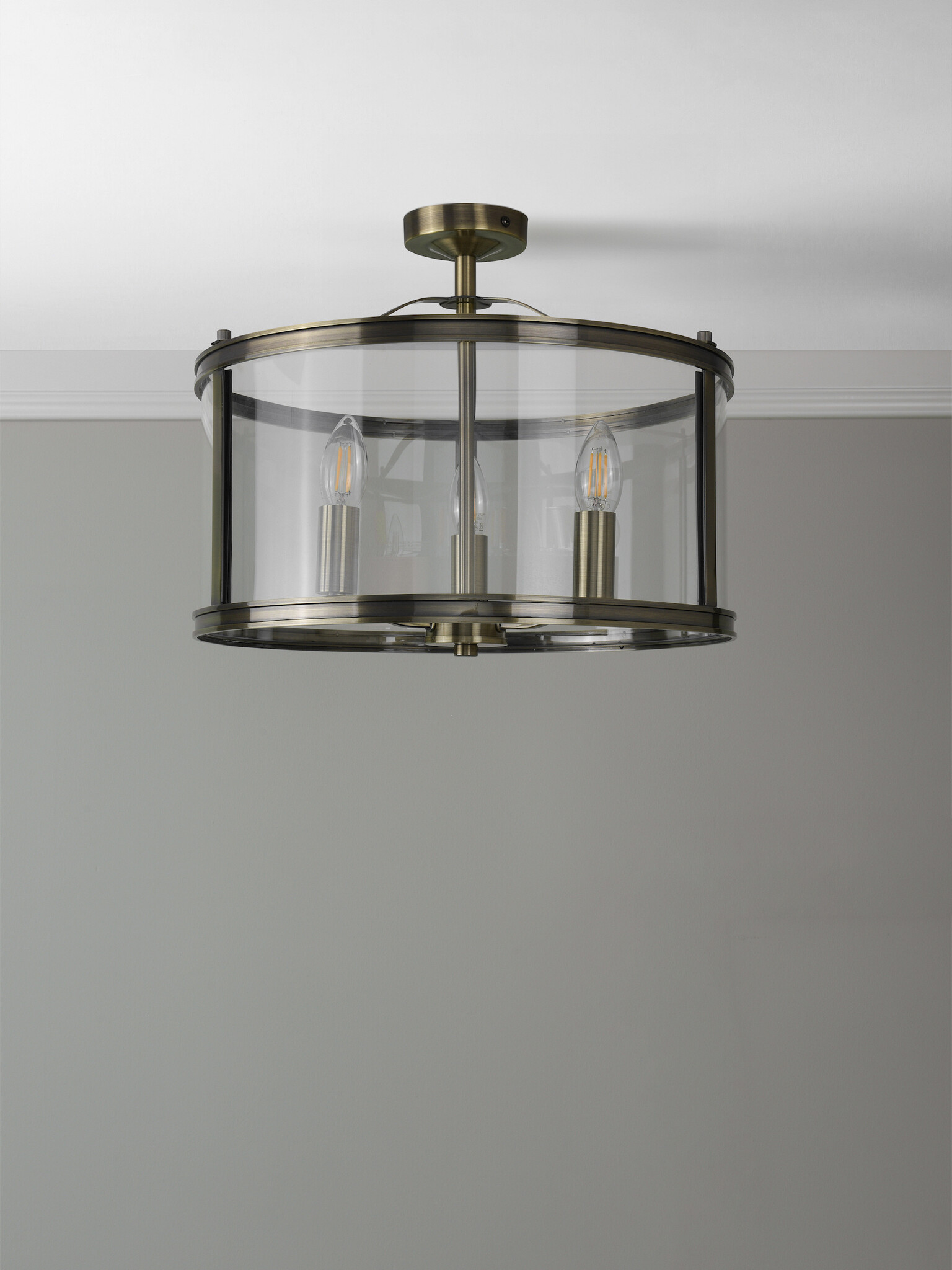 A simple, lantern-style, drum-shaped glass case encases three lamp holders, suspended on a central rod. The antique brass coloured metalwork is the perfect finish, bringing an effortlessly stylish look to your home.