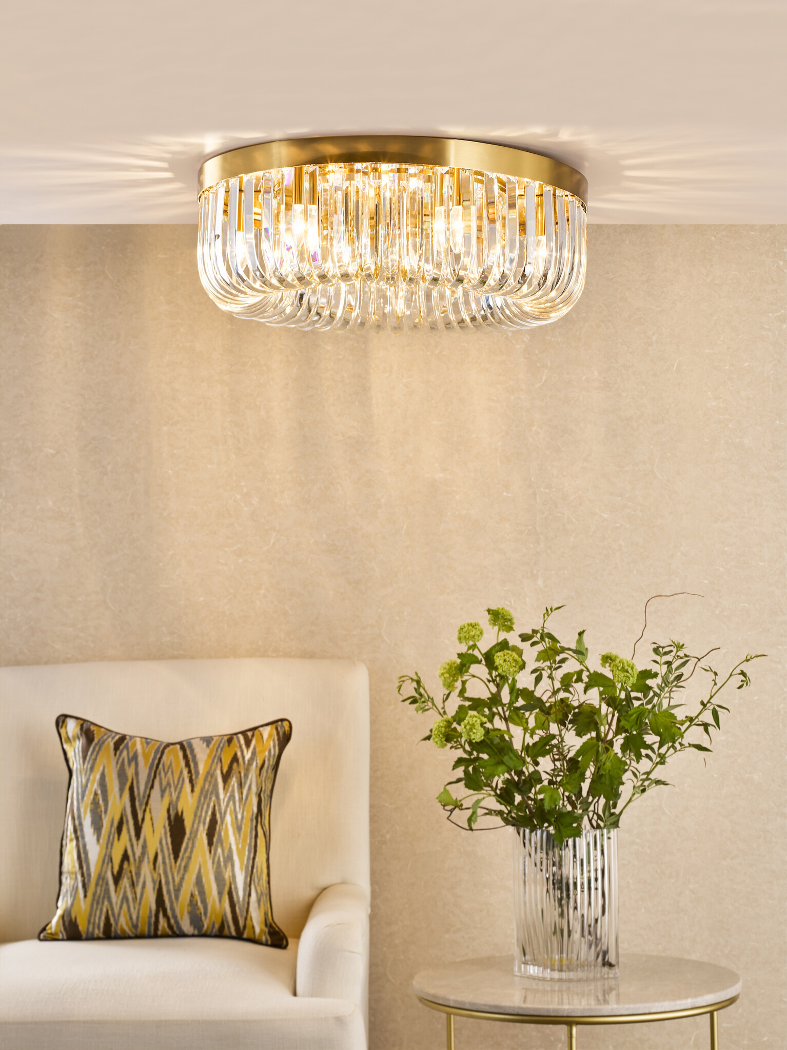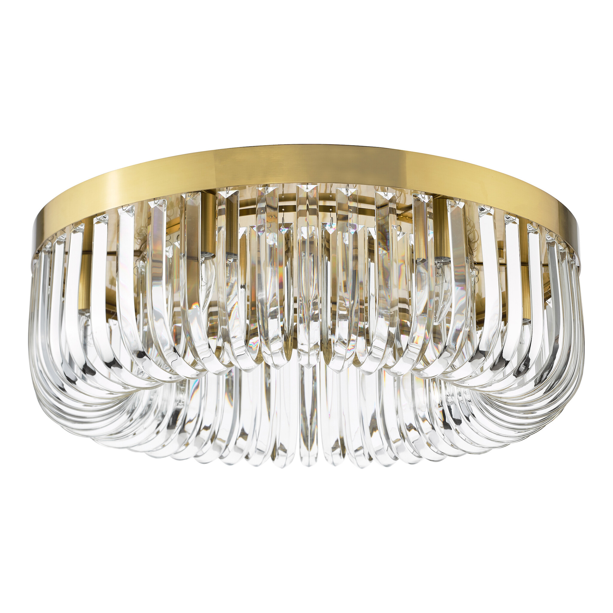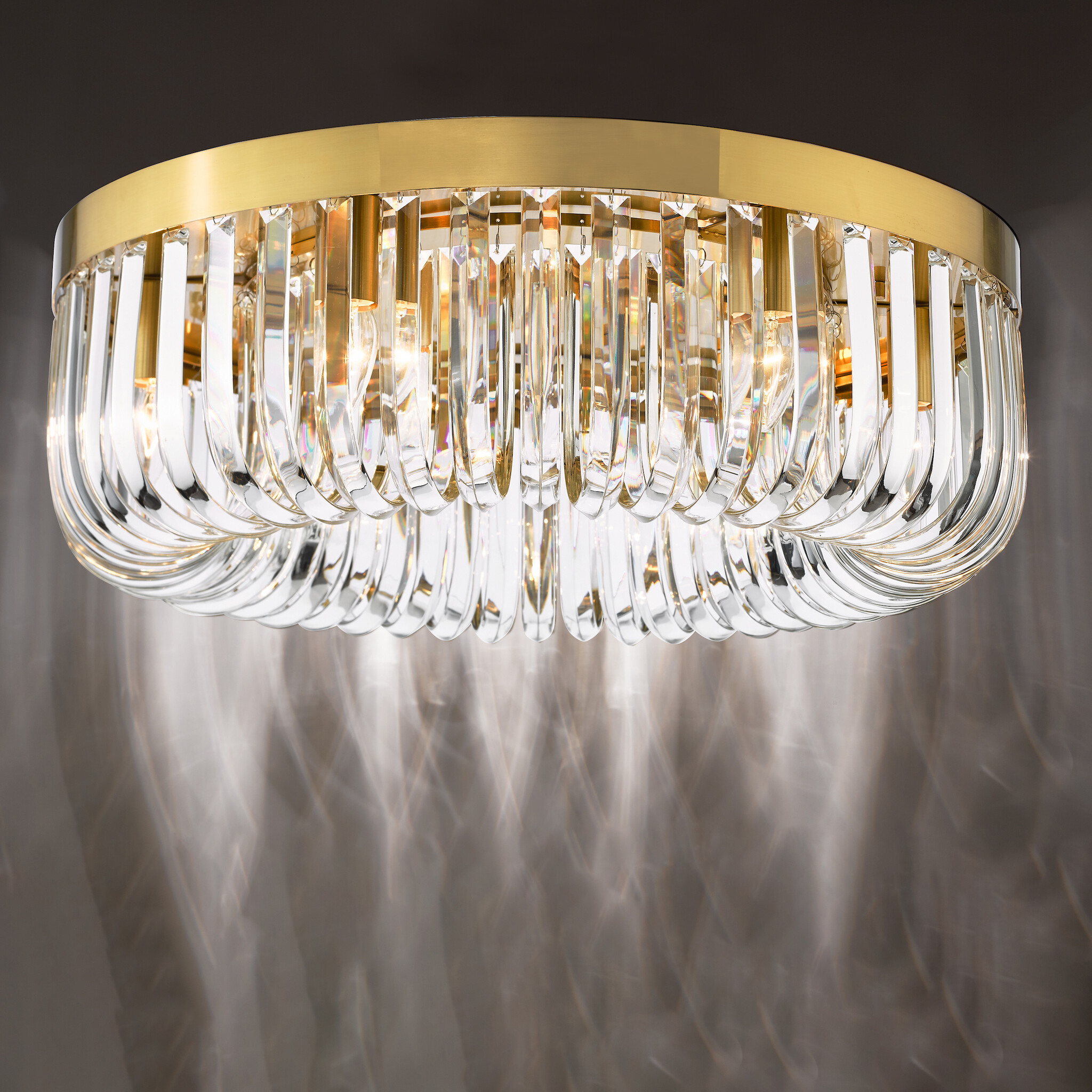 This crystal ceiling light chandelier is effortlessly sleek, with a rounded profile and satin gold hardware. The six light design offers a generous glow, while the flush fitting makes it ideal for low ceiling lighting. With its artful silhouette, this ceiling light will become a luxurious focal point in any hallway or living room.