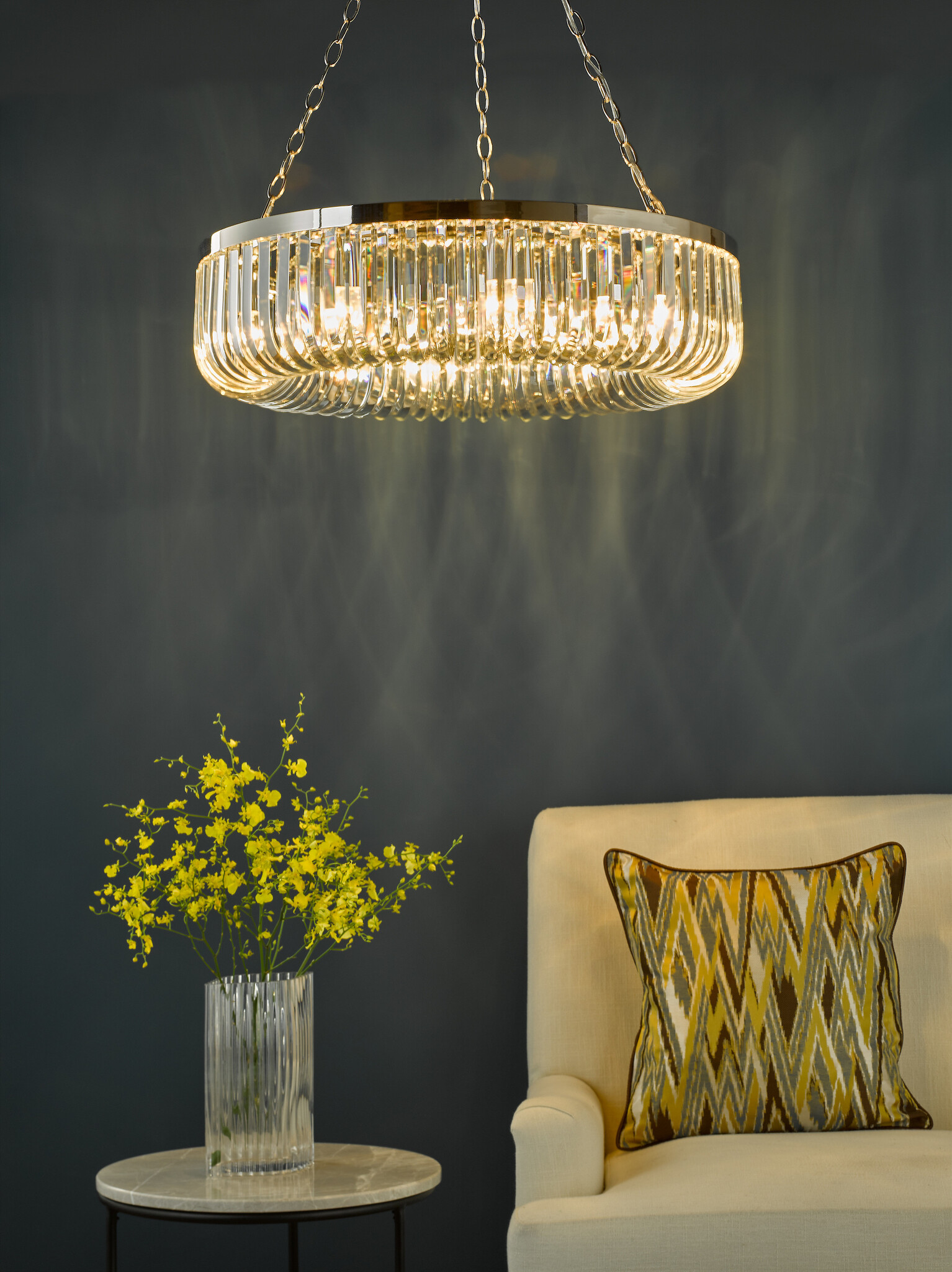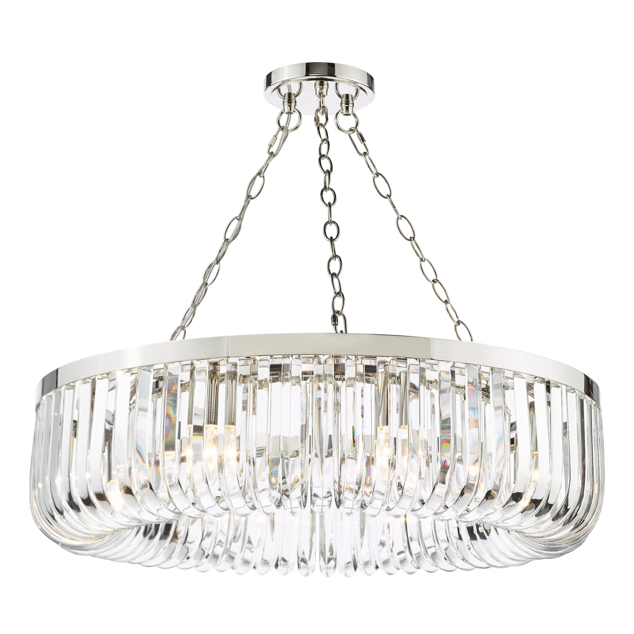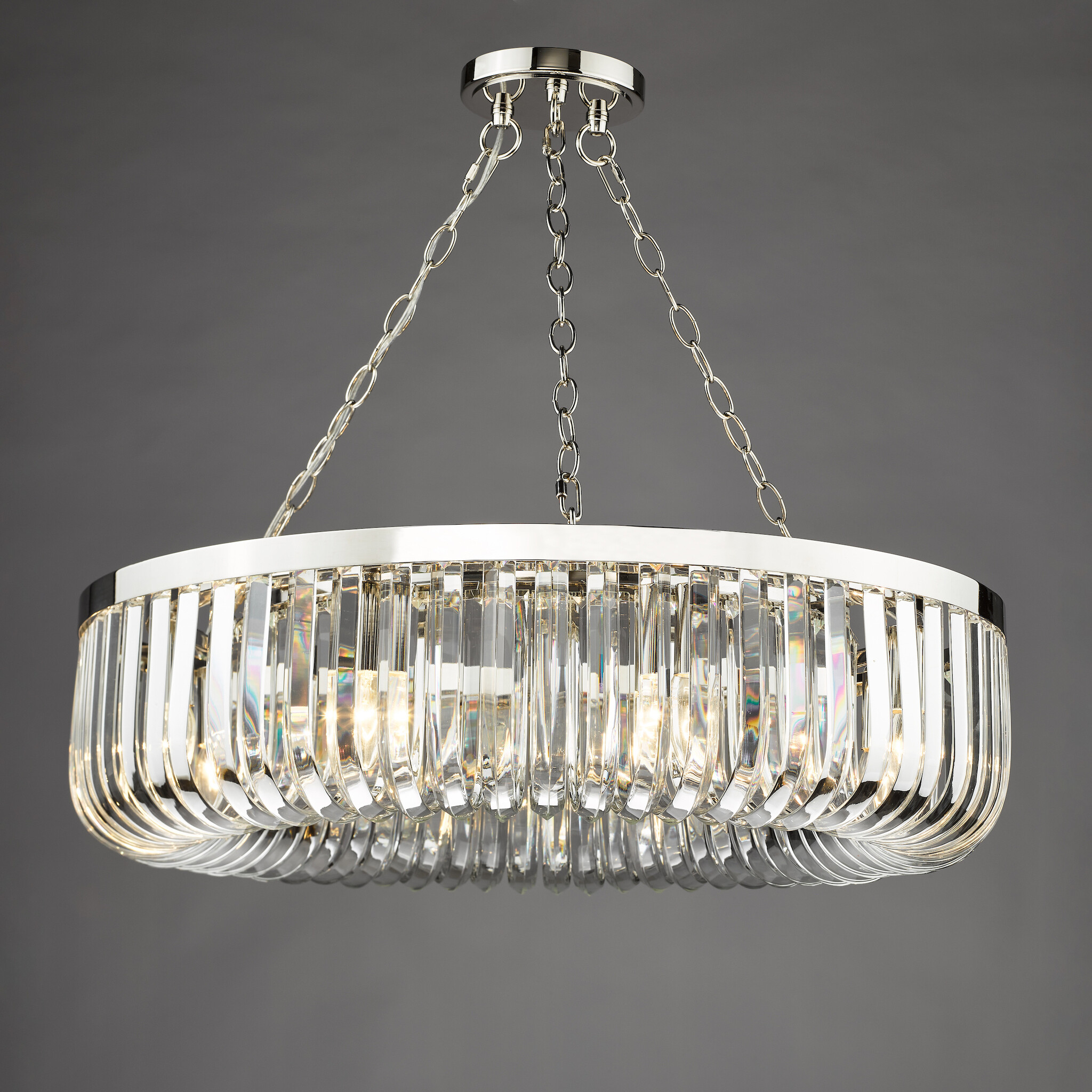 Channelling a feel of refined glamour, this crystal chandelier features a rounded frame with a generous 8 light design for even light diffusion. The frame is adorned with sculpted crystals and suspended from three polished nickel chains, allowing you to adjust the drop of your ceiling light to suit your desired placement. A statement piece perfect for hallway lighting or as a chandelier for the living room, it brings a sense of timeless sophistication to any space.