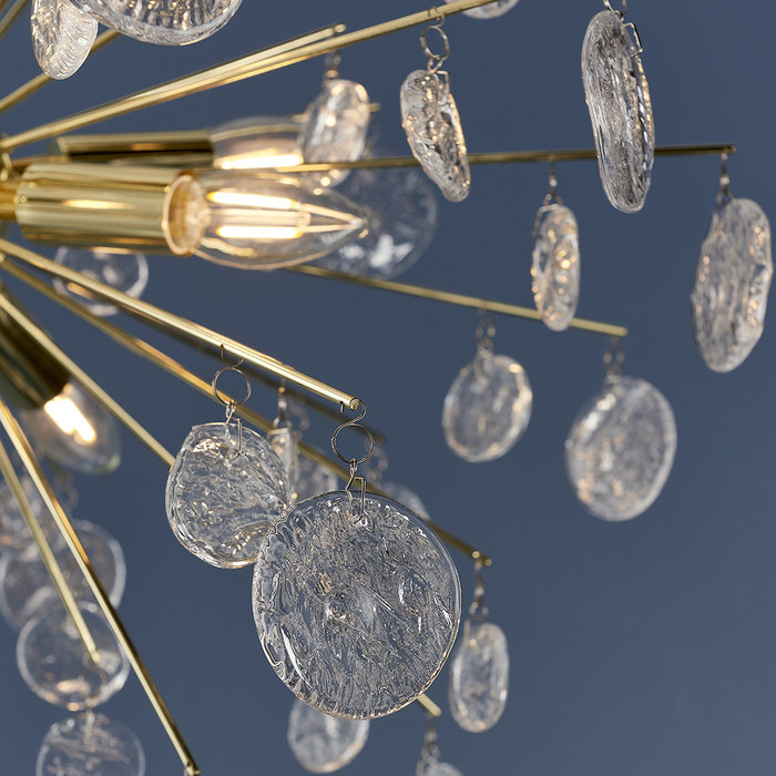 The Kayla is a stunning new design. Delicate gold sphere rods are decorated with droplets of uniquely shaped clear glass that reflect and create amazing light patterns.