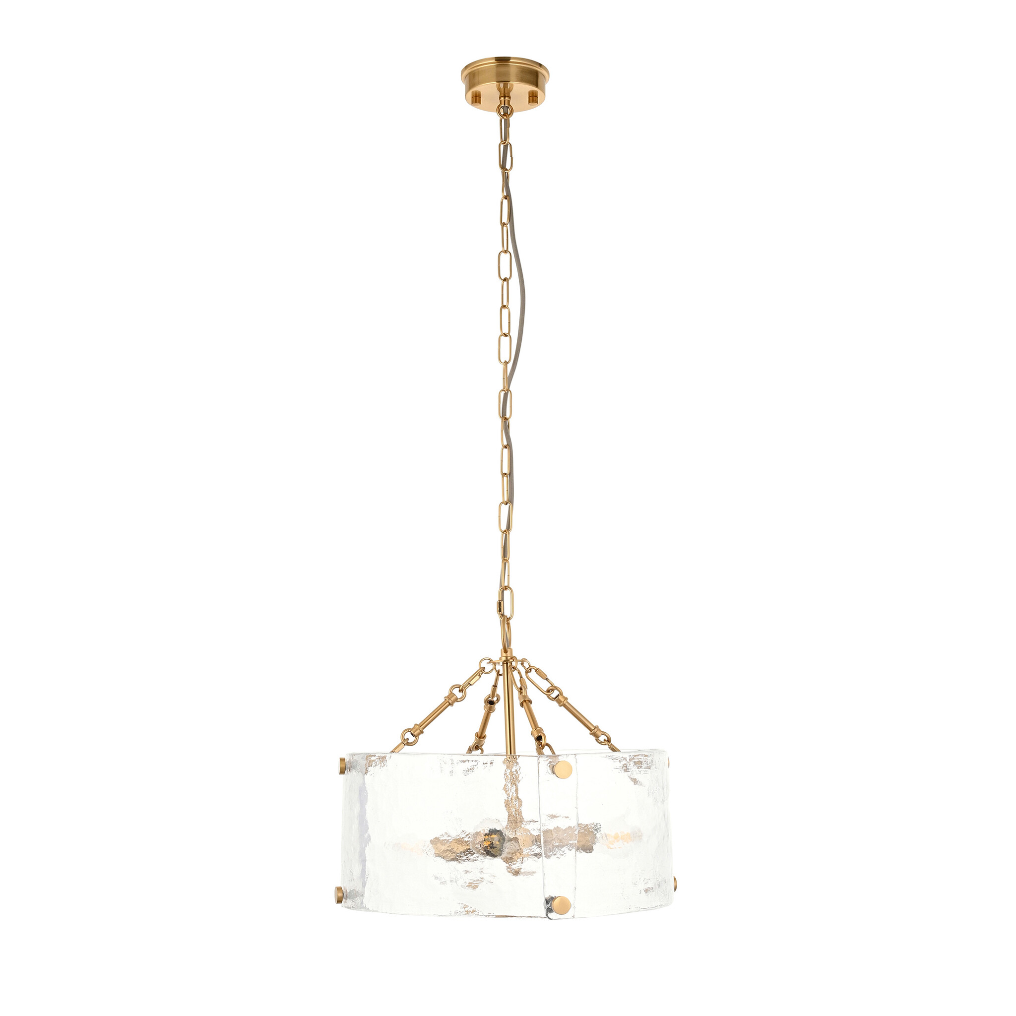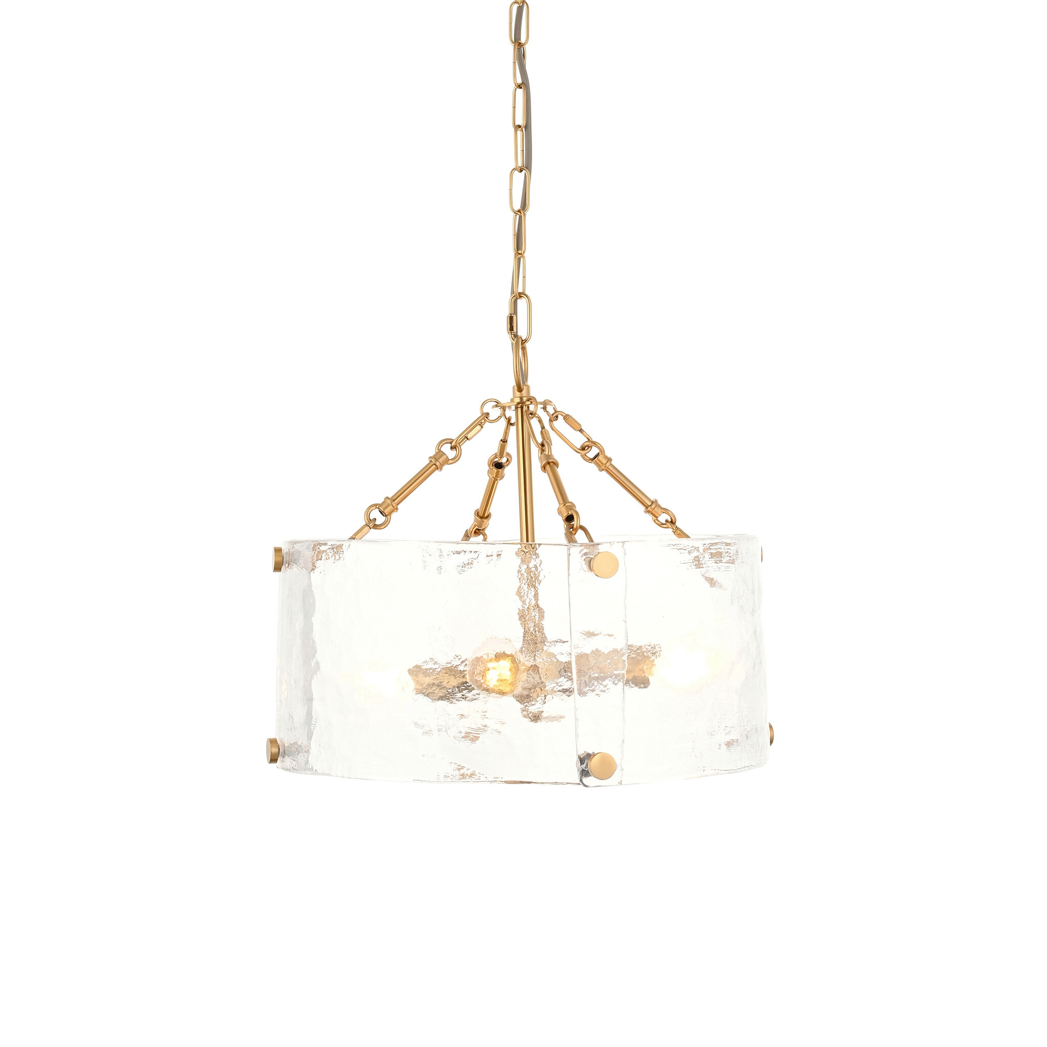 Thick, handmade curved glass panels form a cylindrical shade, each one individually shaped to reflect the light softly and showcase beautiful organic variation. A brushed aged-brass frame with decorative fixings adds warmth and a subtle artisanal touch.