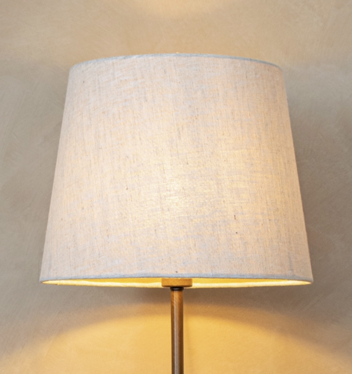 The Lapis Cream Table Lamp - Marble and Brass with Linen Mix Shade features a distinctive stacked stone base made of smooth, polished marble, with five rounded tiers. It is topped with linen mix, neutral fabric shade to create a warm, natural yet refined piece.