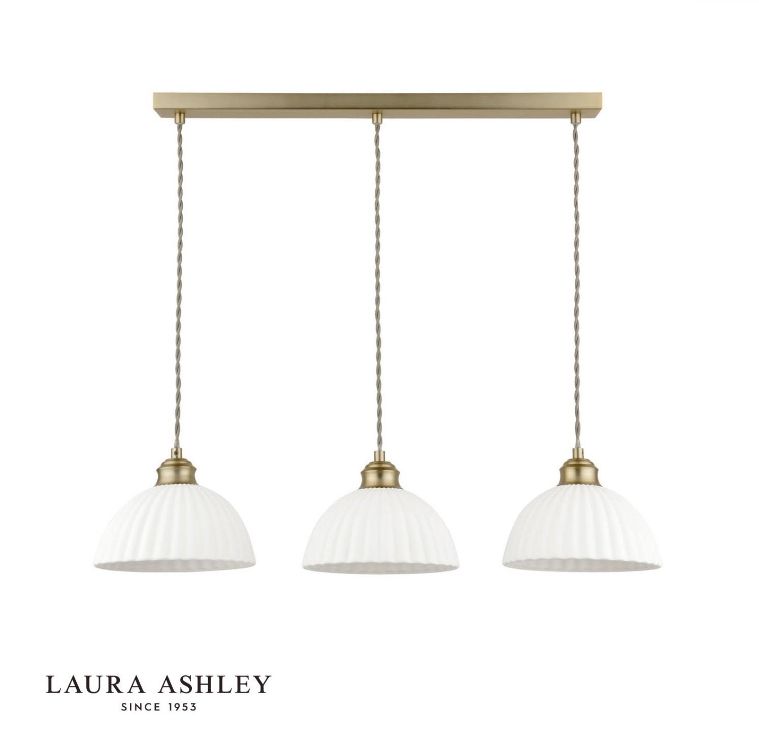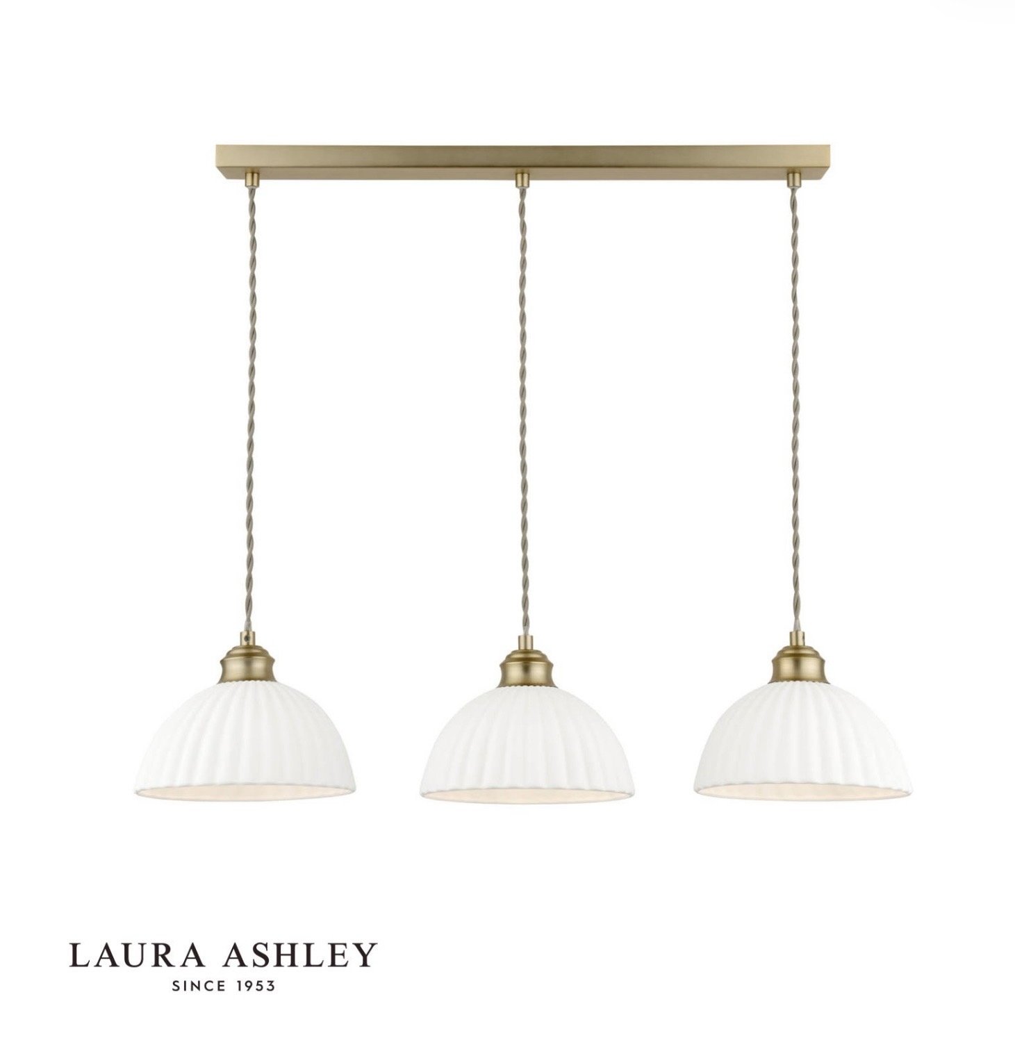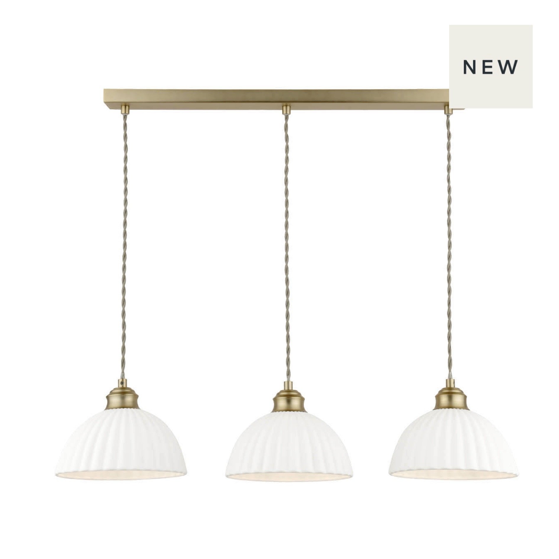 The Durford 3 Light bar pendant from Laura Ashley is built for the surfaces that matter most. Three ribbed white ceramic shades hang at even intervals from a slim matt antique brass bar, each one directing a warm, focused glow downward — exactly what a kitchen island or dining table needs. It’s a fitting that combines genuine practicality with the kind of classic British style that Laura Ashley has delivered since 1953.