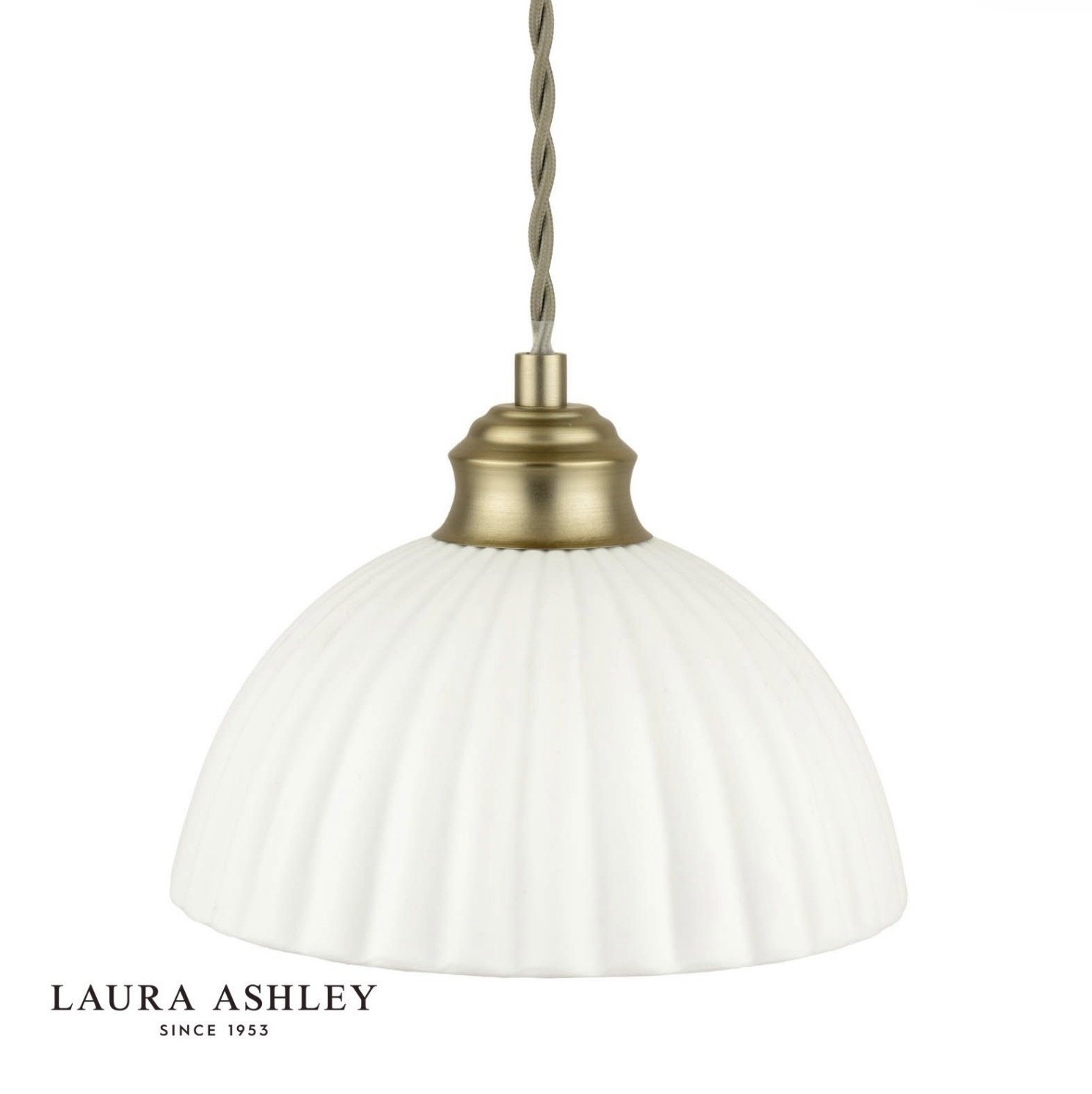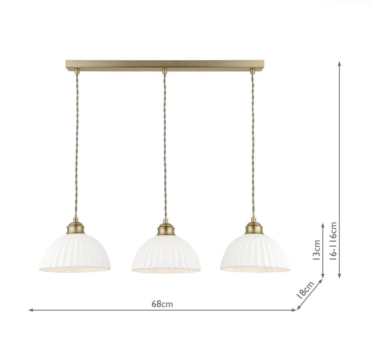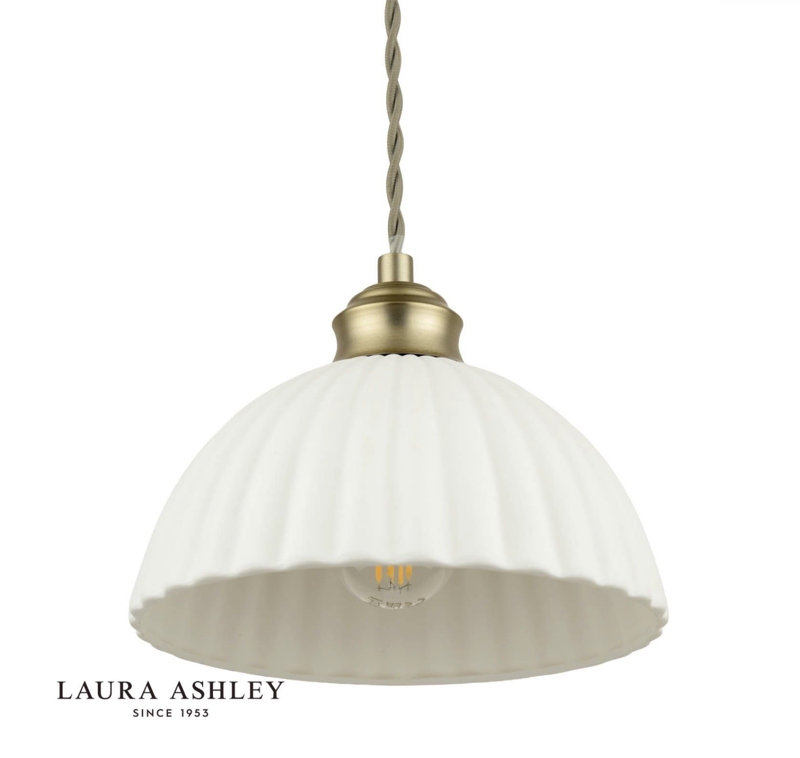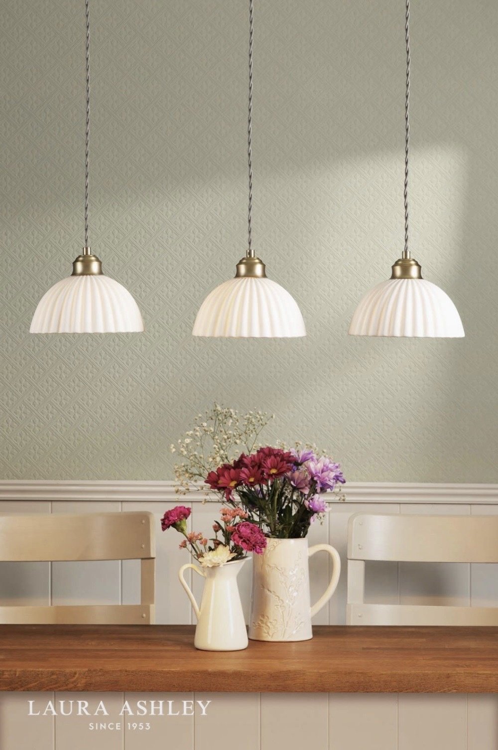 The Durford 3 Light bar pendant from Laura Ashley is built for the surfaces that matter most. Three ribbed white ceramic shades hang at even intervals from a slim matt antique brass bar, each one directing a warm, focused glow downward — exactly what a kitchen island or dining table needs. It’s a fitting that combines genuine practicality with the kind of classic British style that Laura Ashley has delivered since 1953.