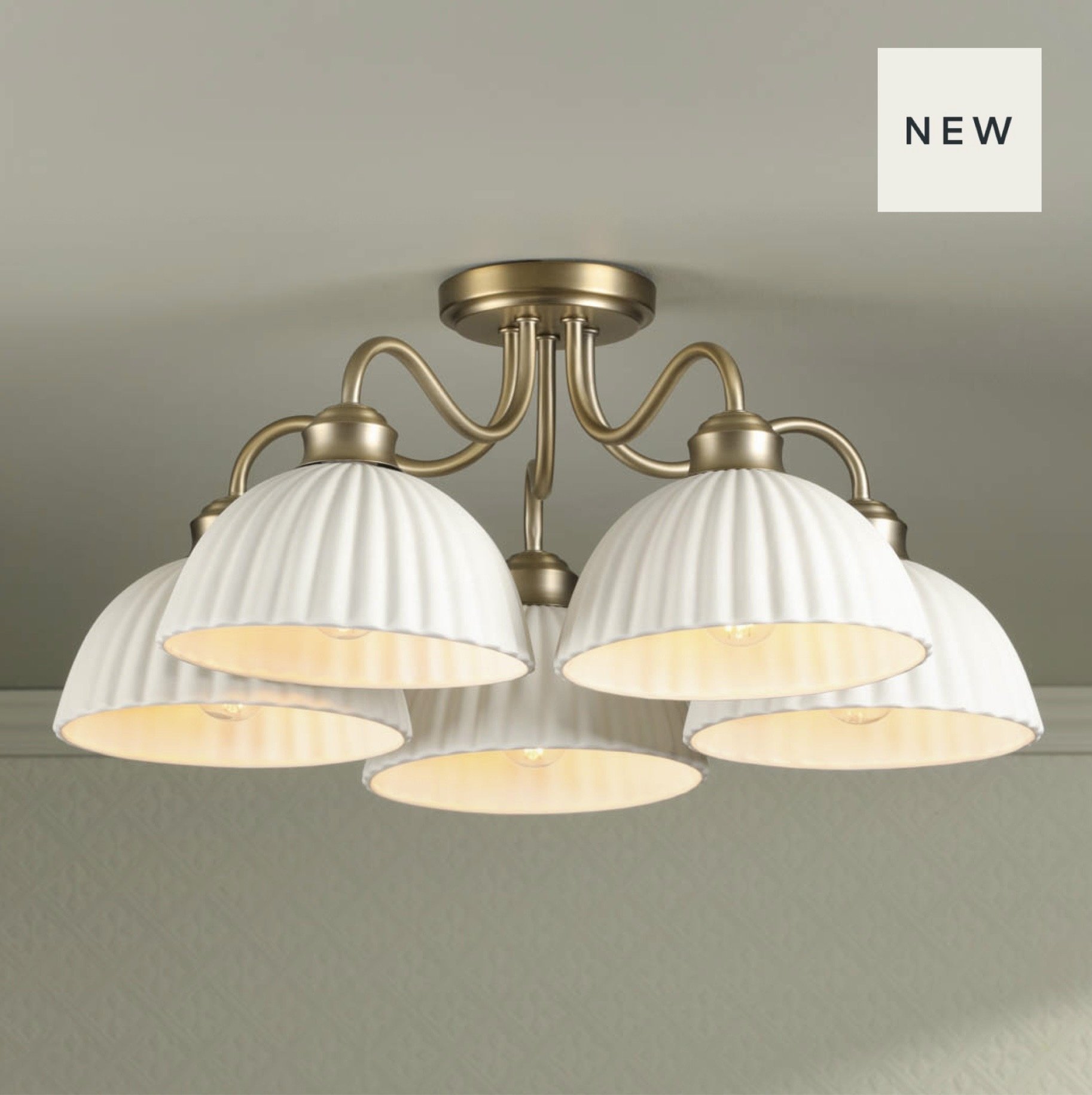 Five ceramic shades, one matt antique brass frame — classic British style overhead.