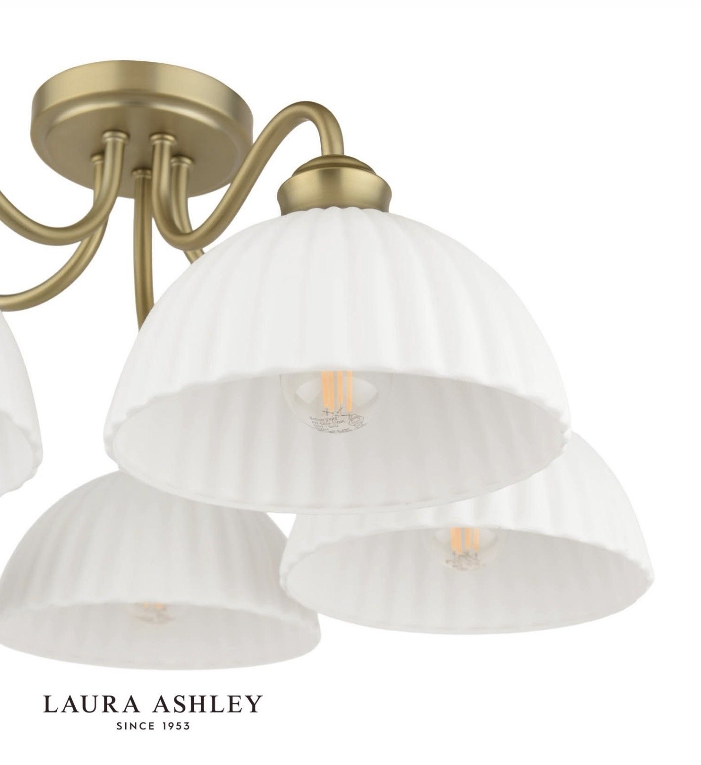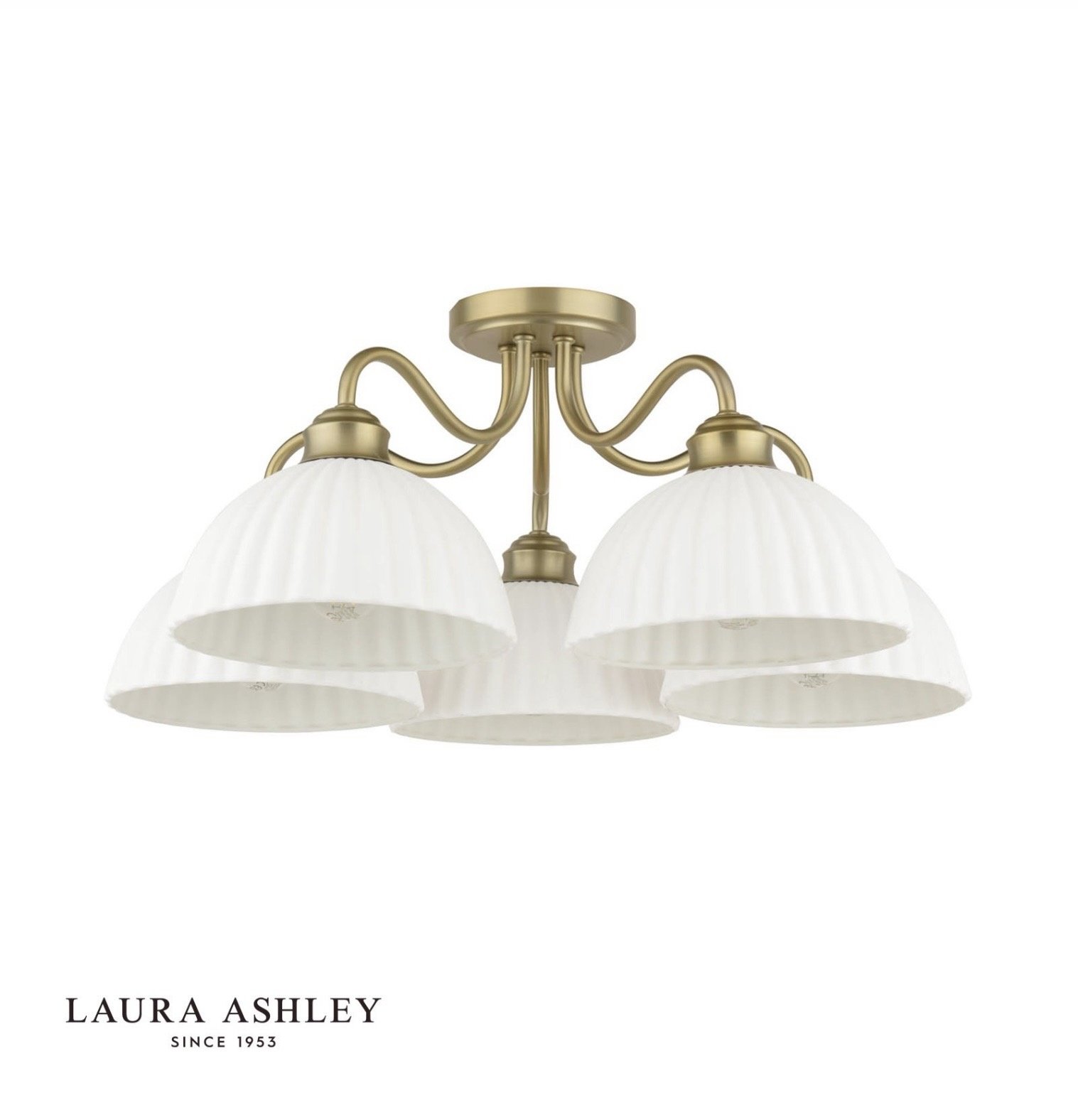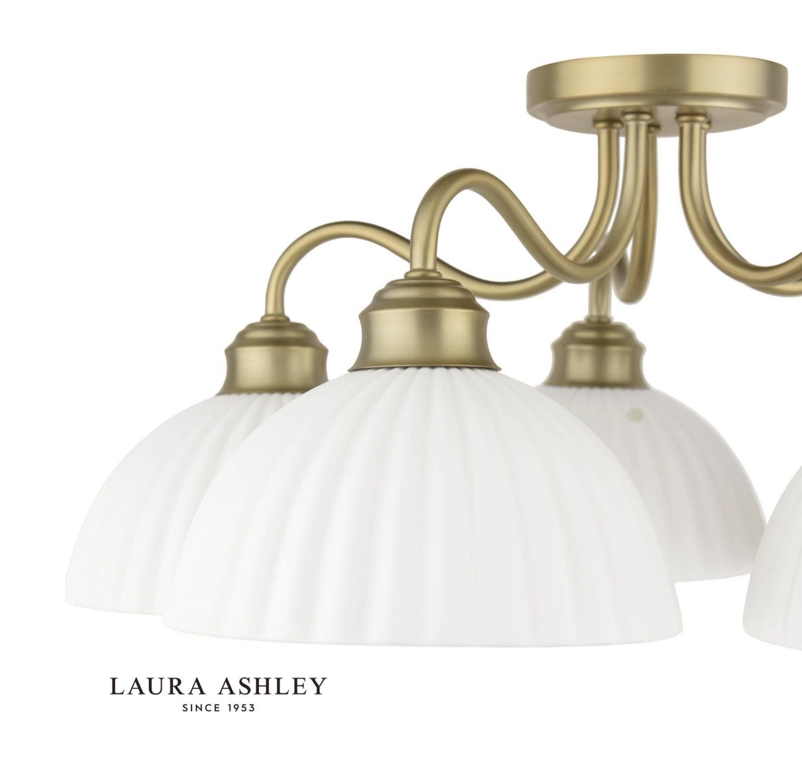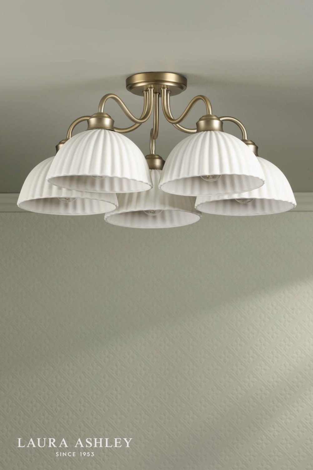 The semi-flush format keeps the fitting close to the ceiling, making it a practical choice for living rooms, kitchens, hallways and bedrooms where ceiling height is standard rather than generous. The white ceramic shades soften the light beautifully, and the matt antique brass frame gives the whole fitting a warmth and depth that polished finishes rarely achieve. Laura Ashley’s signature attention to detail is evident throughout — from the curve of each arm to the proportion of each shade.
