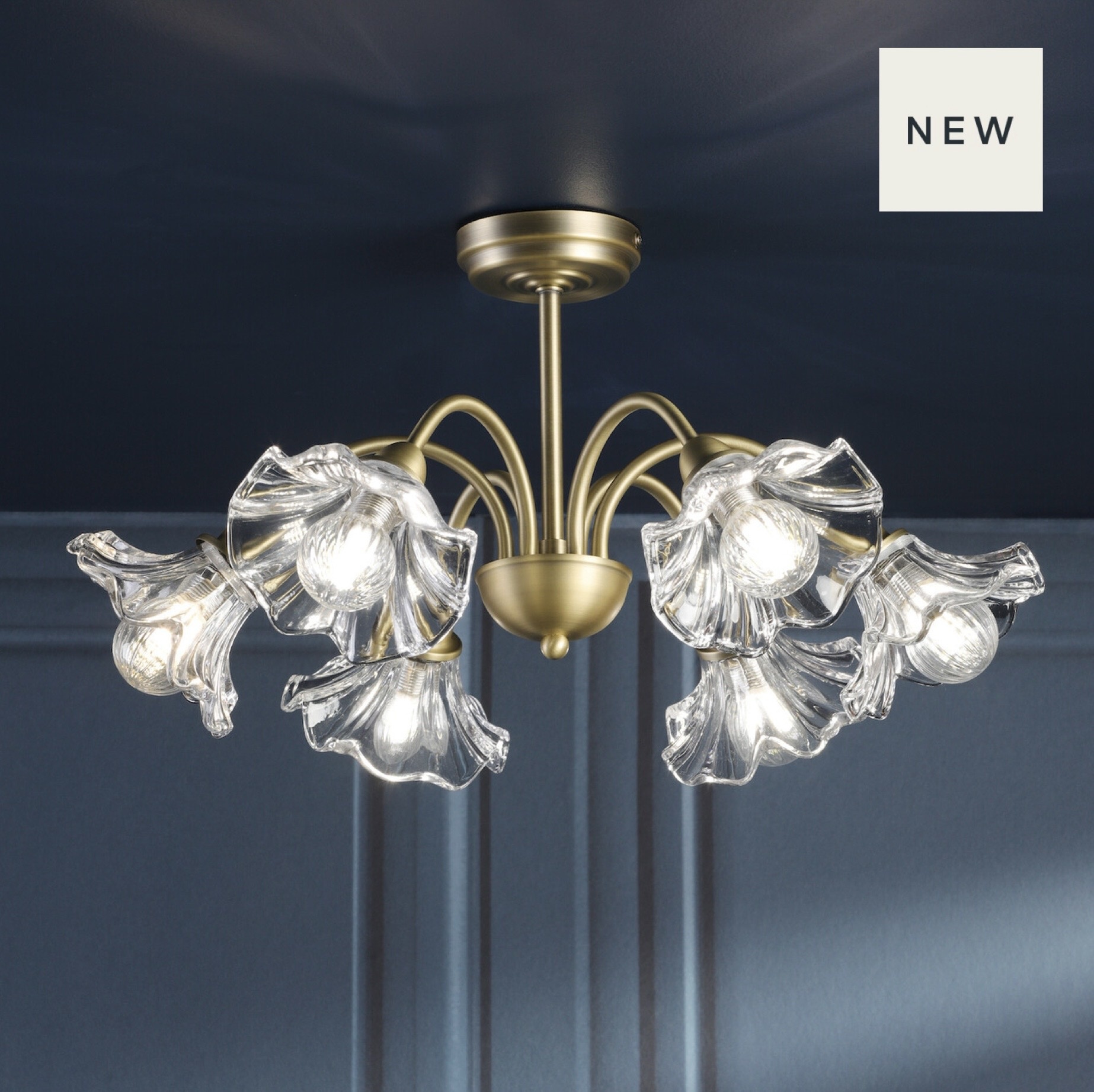Equal parts statement-making and elegant, the Kerswell Semi-Flush Ceiling Light has been crafted from antique brass and designed with six light points for a generous glow. The glass shades have been shaped to resemble open floras, to bring a touch of soft femininity to any interior. Ideal for bedrooms and cosy living spaces alike, its semi-flush profile makes it perfect for low ceilings.