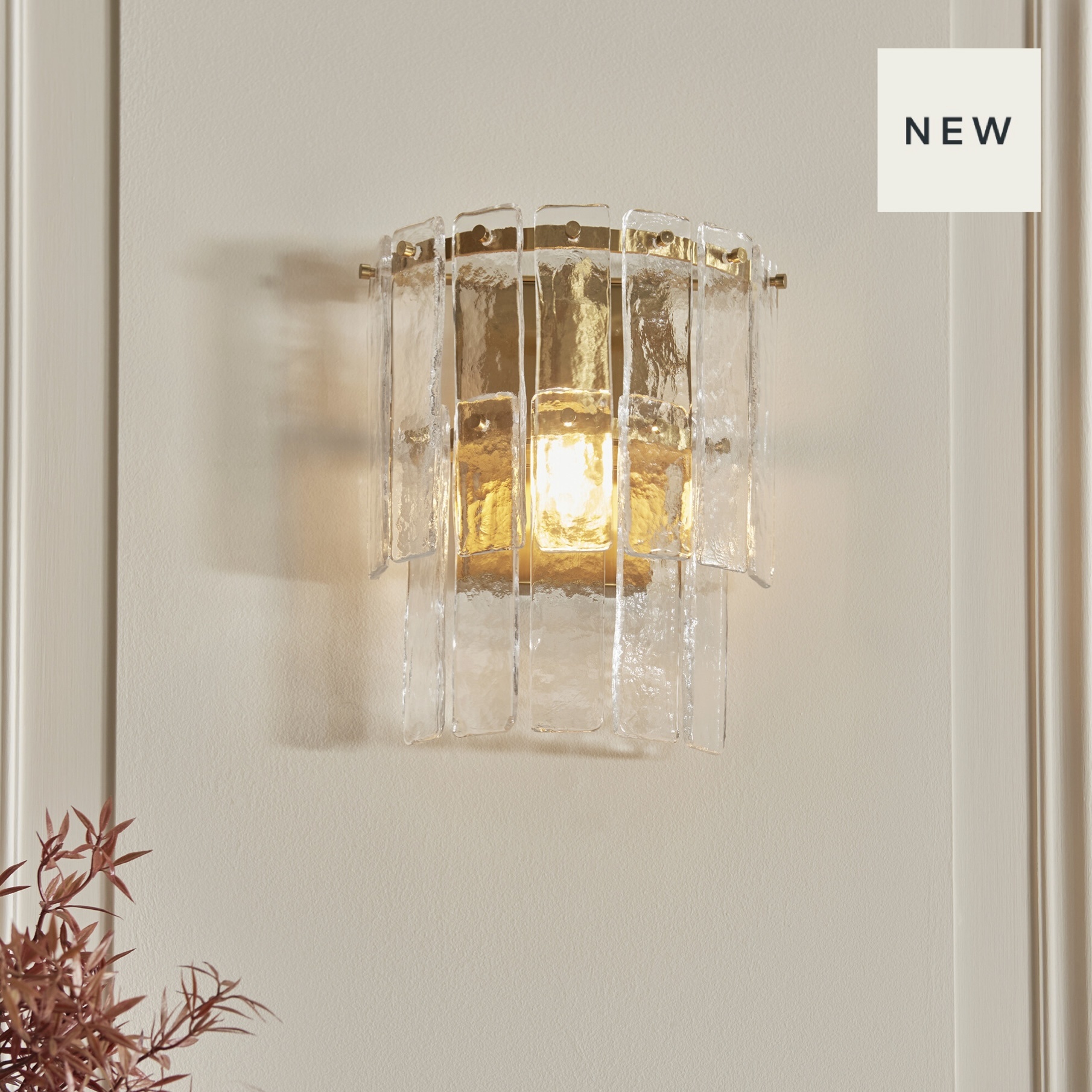 Inspired by vintage Venetian art lighting and rich in texture this single glass wall light features a layered arrangement of handmade glass panels that shimmer with natural variation and depth.