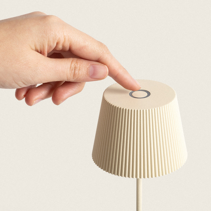 The Luce - Rechargeable Table Lamp is made from aluminium, with a circular base, slender stem and tapered, corrugated shade all in a beige finish.