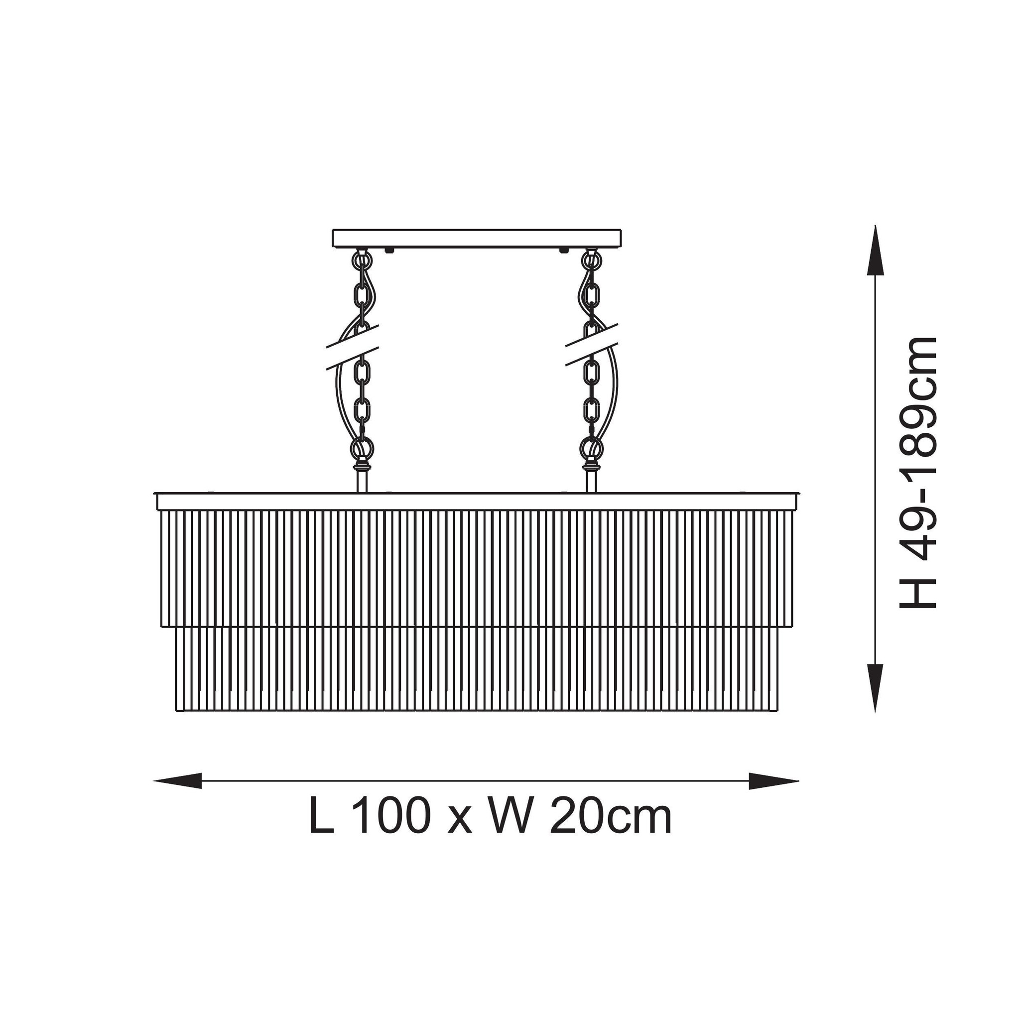 Suspended from twin height-adjustable chains, the balanced, elongated form makes it ideal for positioning over dining tables or kitchen islands, offering both ambient glow and visual drama.