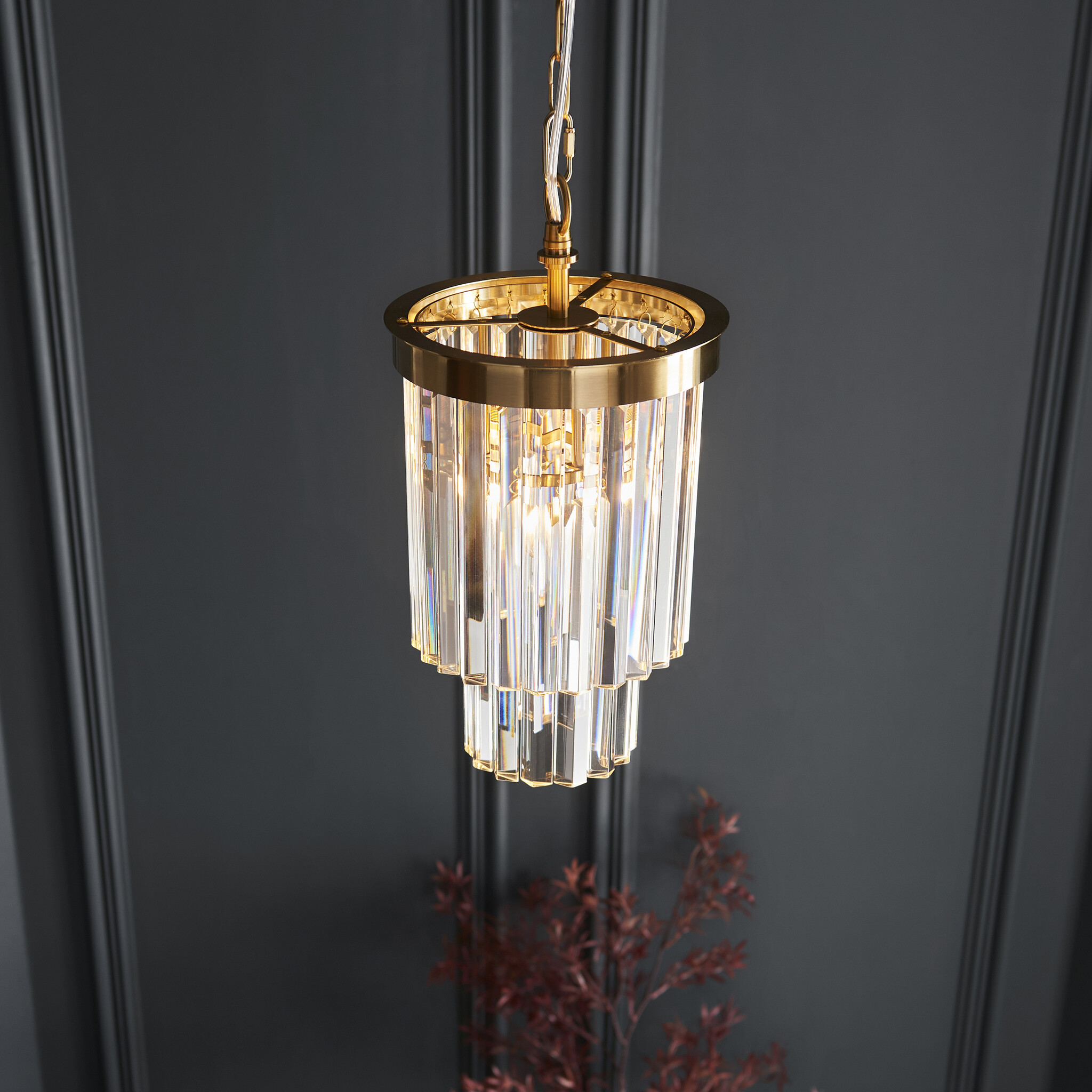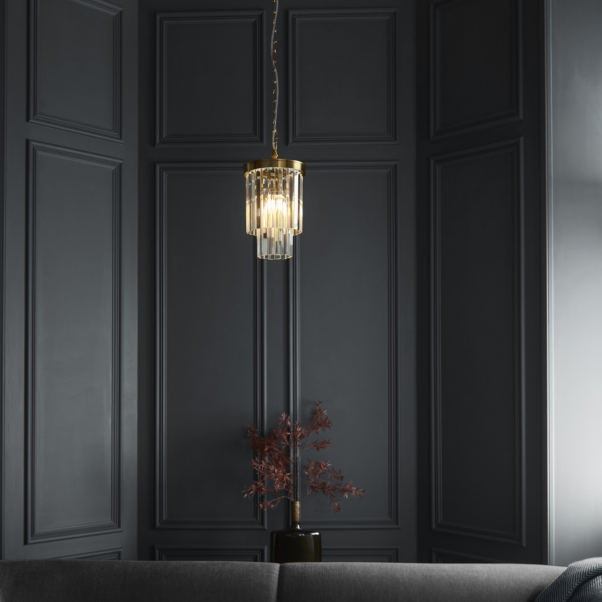 The compact scale — at just 21cm in diameter — makes it an ideal bedside pendant, a small hallway pendant or hung in a series over islands for a touch of Art Deco-inspired sophistication.
