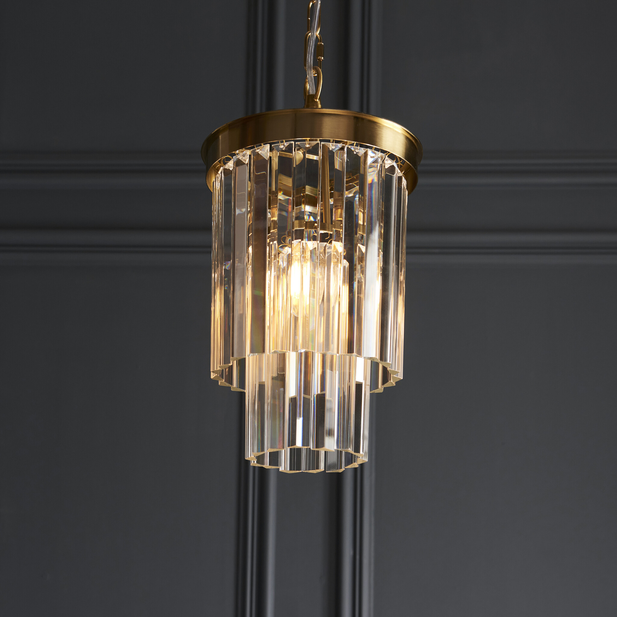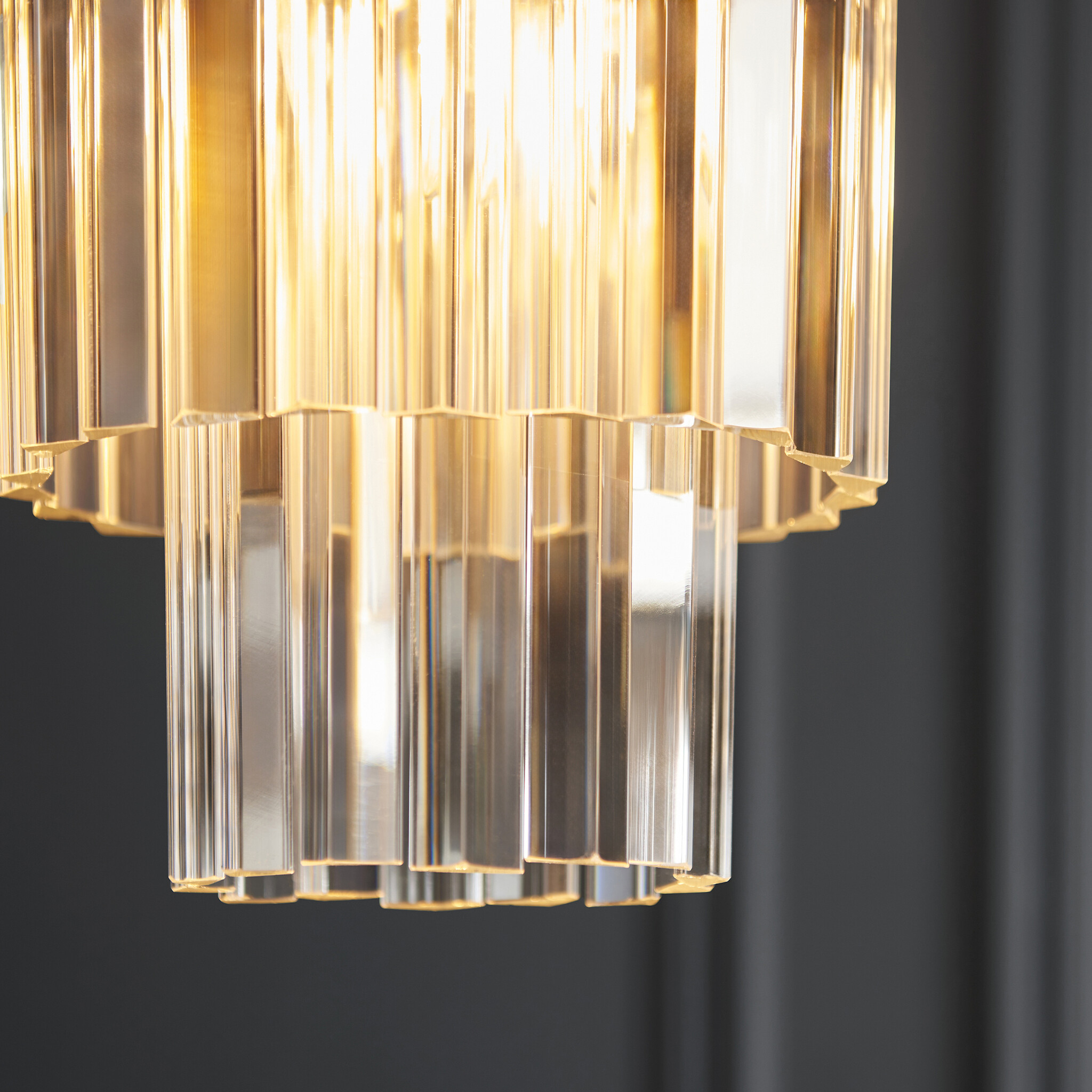 A striking arrangement of angled glass lozenges cascades gracefully from a warm brushed aged brass frame, creating a timeless tiered silhouette that sparkles beautifully when lit.