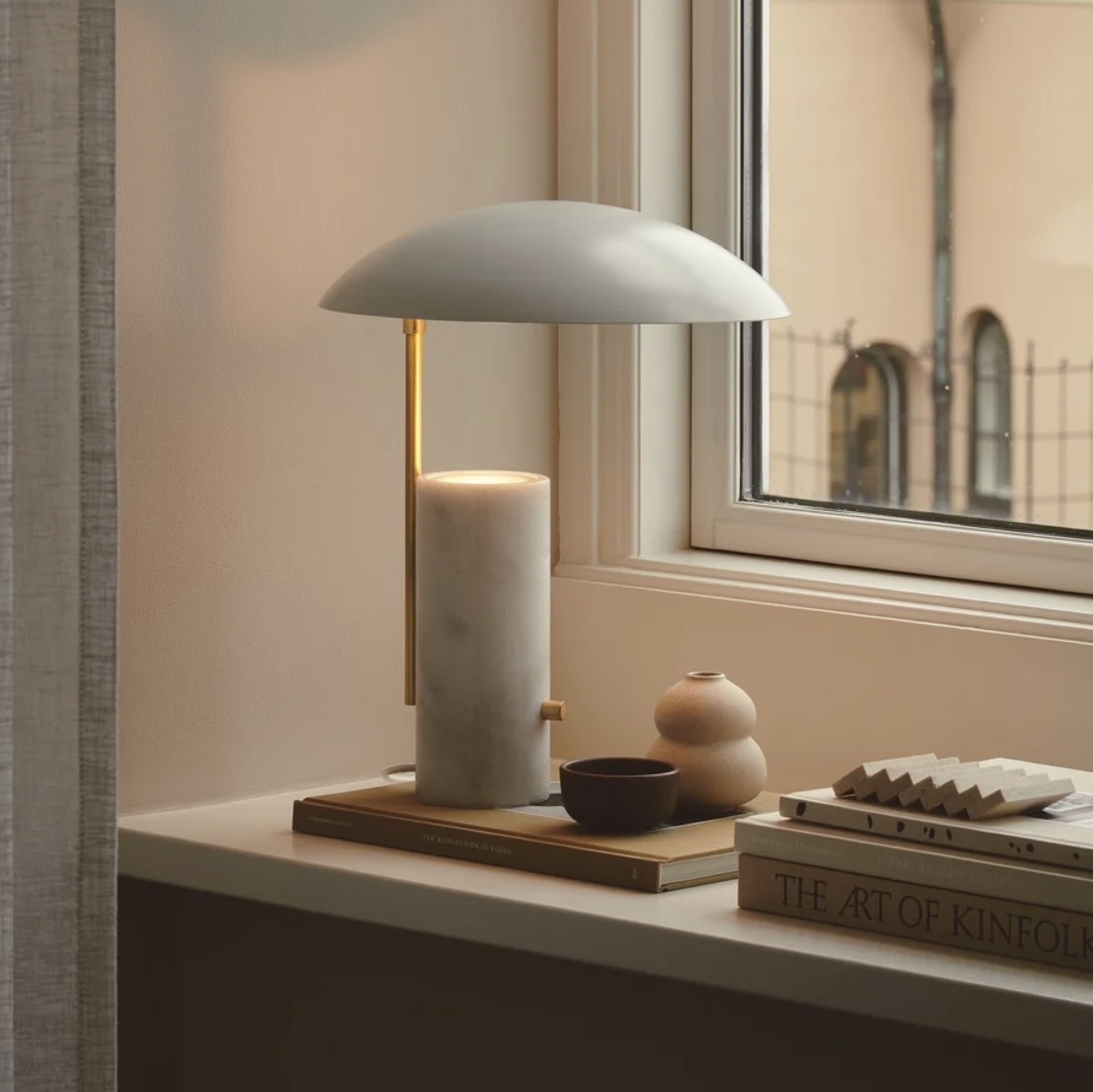 The Madem Scandi table lamp, from the Danish design studio Mavro/Lefevre, has a fun, light-hearted design expression. The round domed shade sits proud above the marble base, held aloft by the gold finished arm. The light is reflected upward into the shade, where the concave reflects the light back out. The result is a soft, indirect ambience, an effect that makes this Scandi table lamp the perfect fit for the bedside table or the living room.