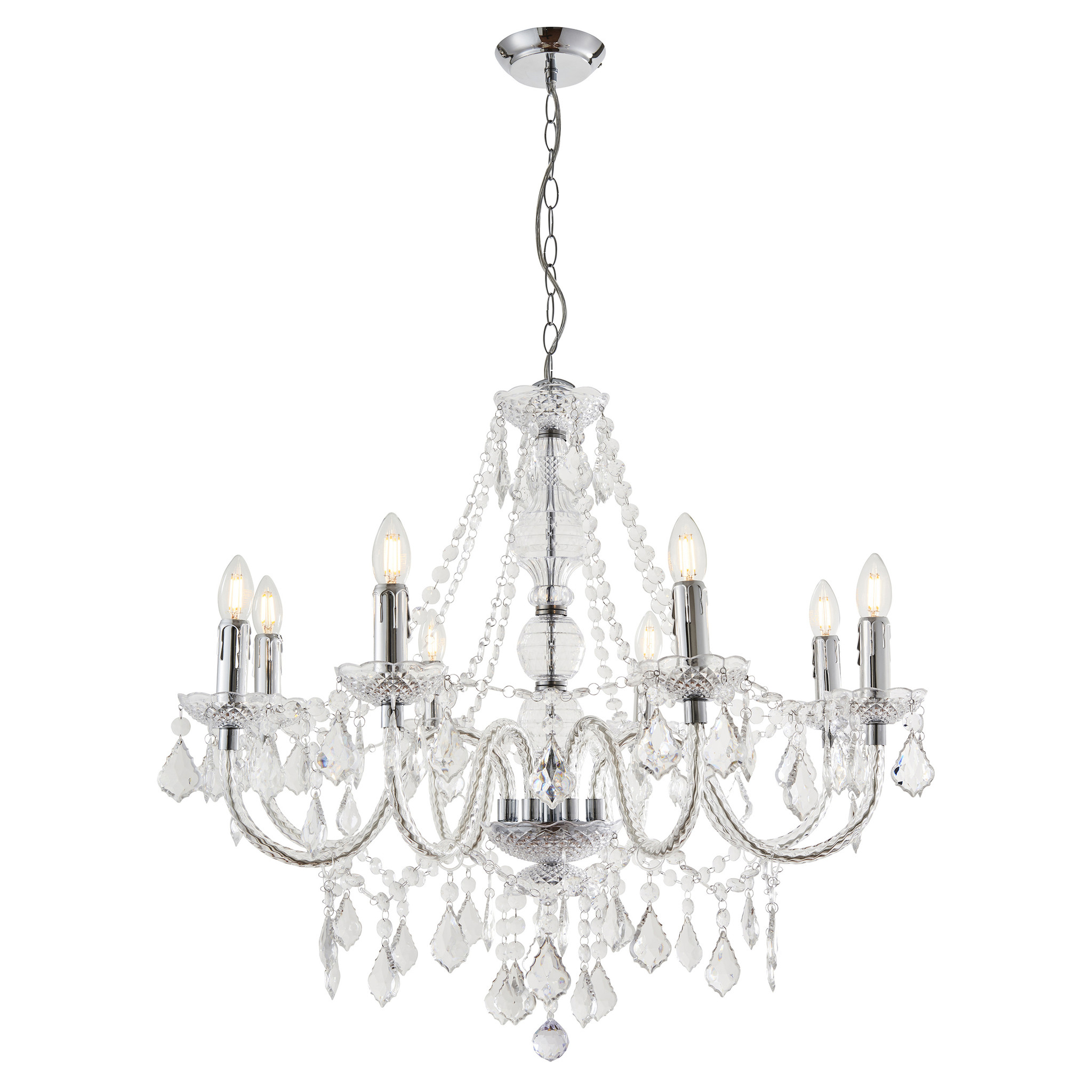 An 8 light chandelier with clear acrylic beading, facets and droplets. Comes with a fully adjustable chain to extend the drop of the light up to a maximum 1.8m.