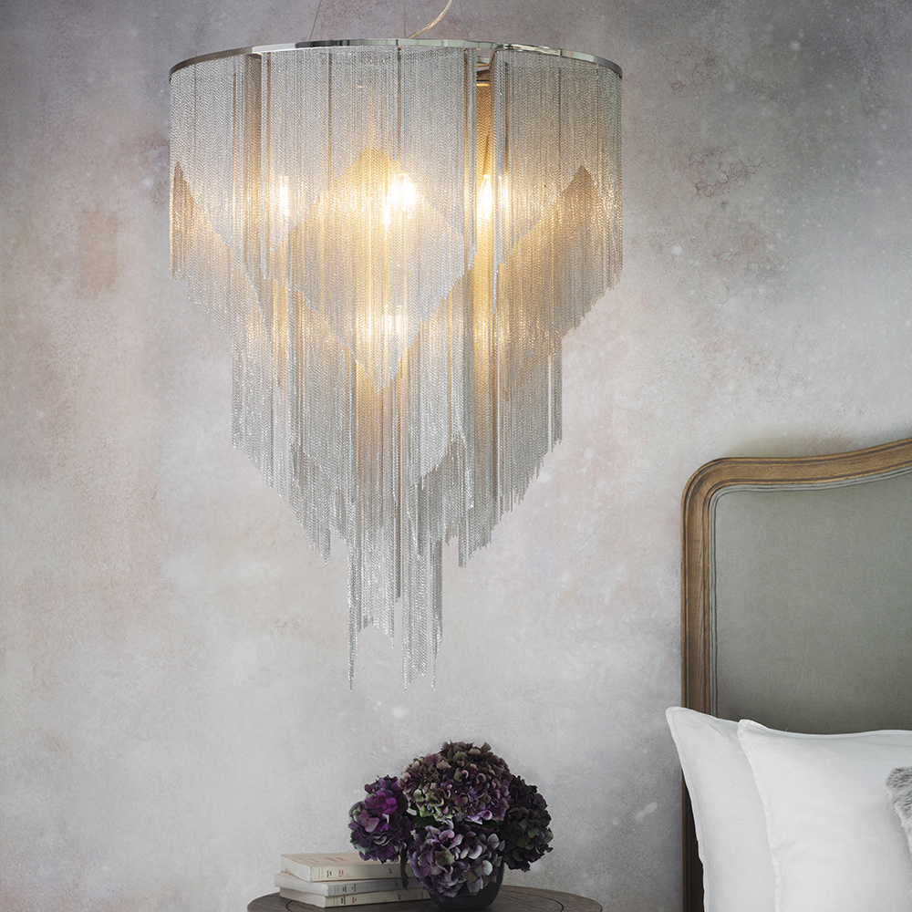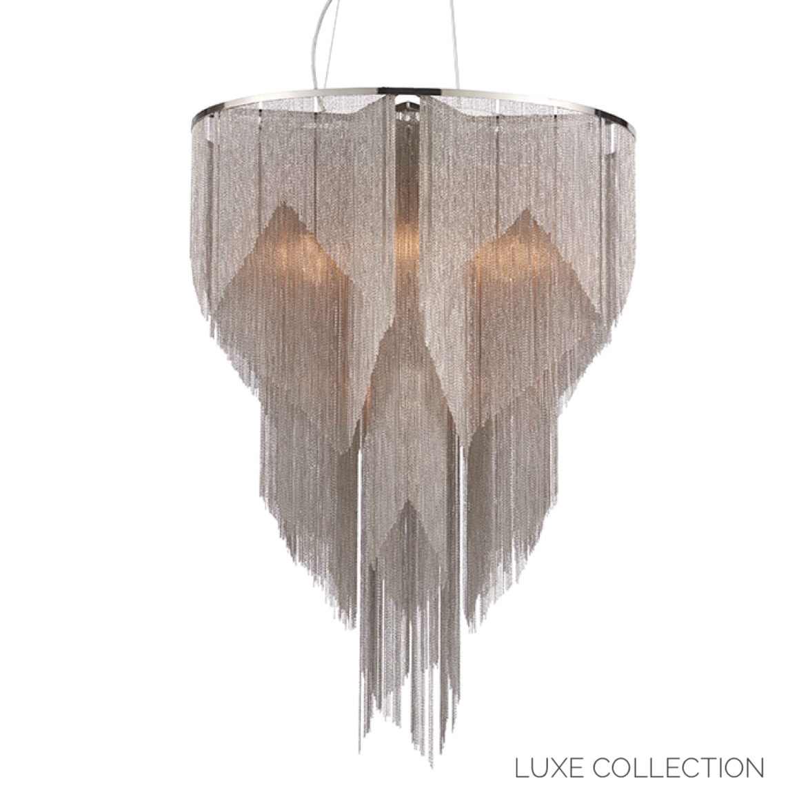 A stunning addition to both classic and modern interiors; the Moire Pendants are carefully and delicately hand dressed with thousands of fine cascading chains, creating a lavish work of art. The perfect centre piece. This fitting combines bright nickel and silver finishes.