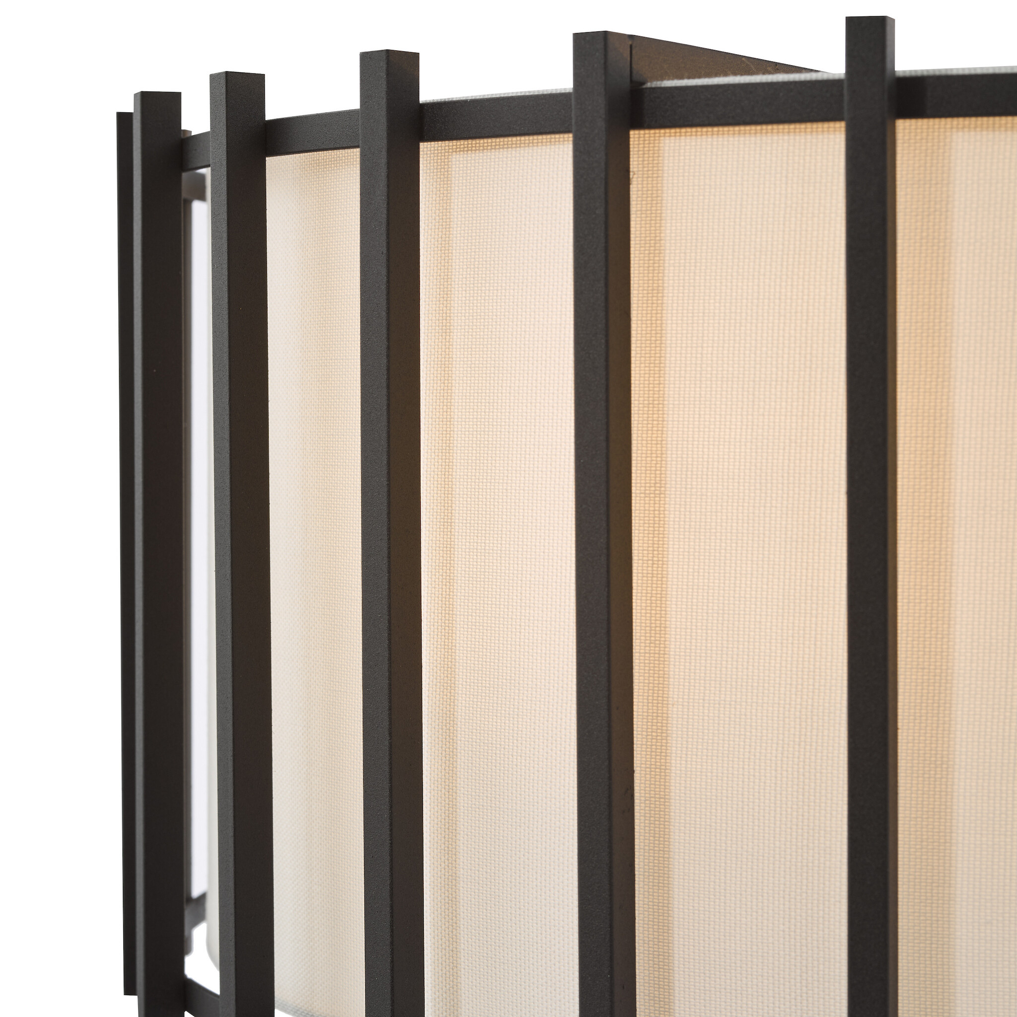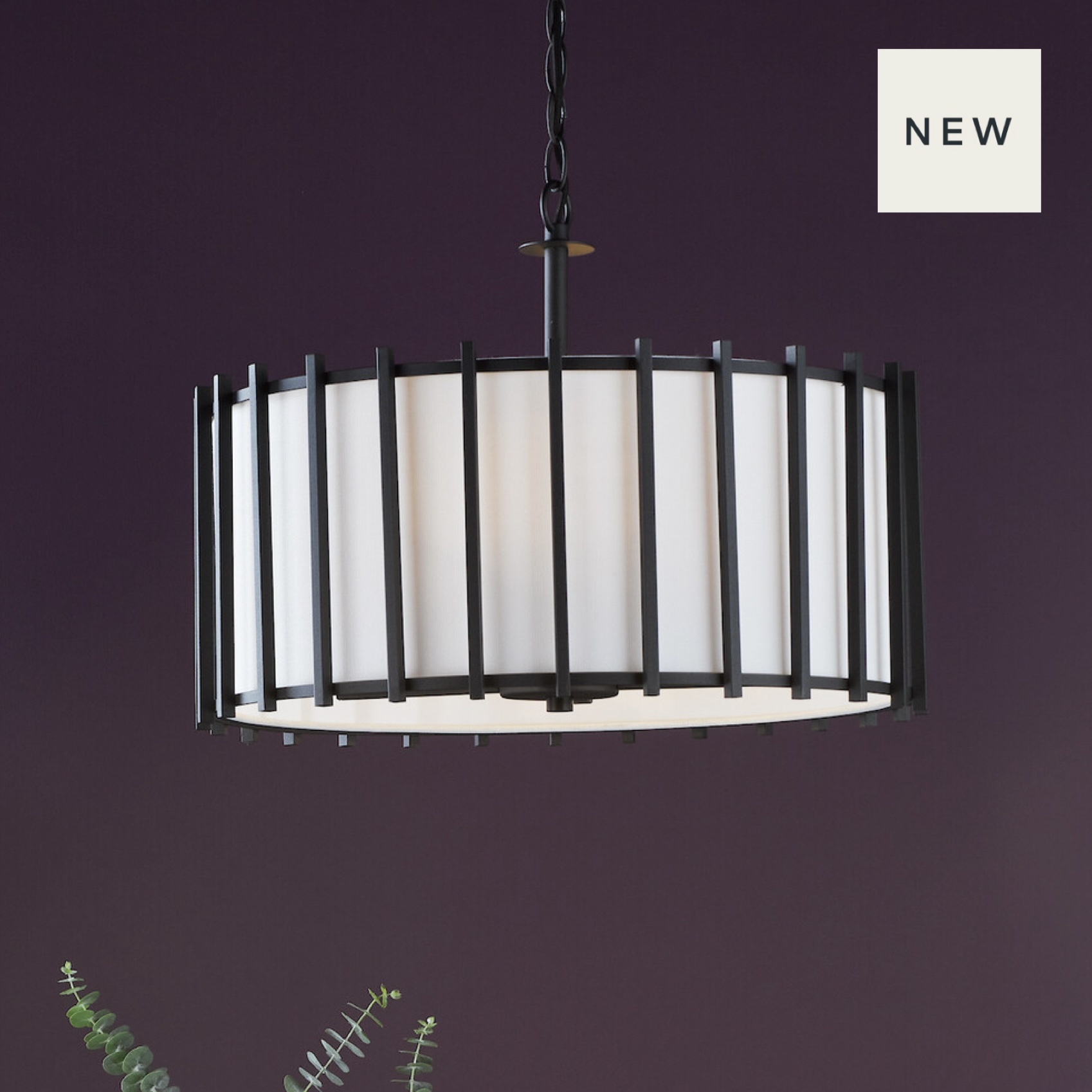 Crafted with a rounded profile, this black pendant light showcases a caged design with an ivory linen drum, encased in a matt black frame. It’s complete with a dual mount, meaning this black ceiling light can be fitted for a semi-flush finish or hung as a pendant. The warm throw of light is artfully offset by the slender spokes of the frame, for an inviting glow that brings effortless ambiance to a range of interiors.