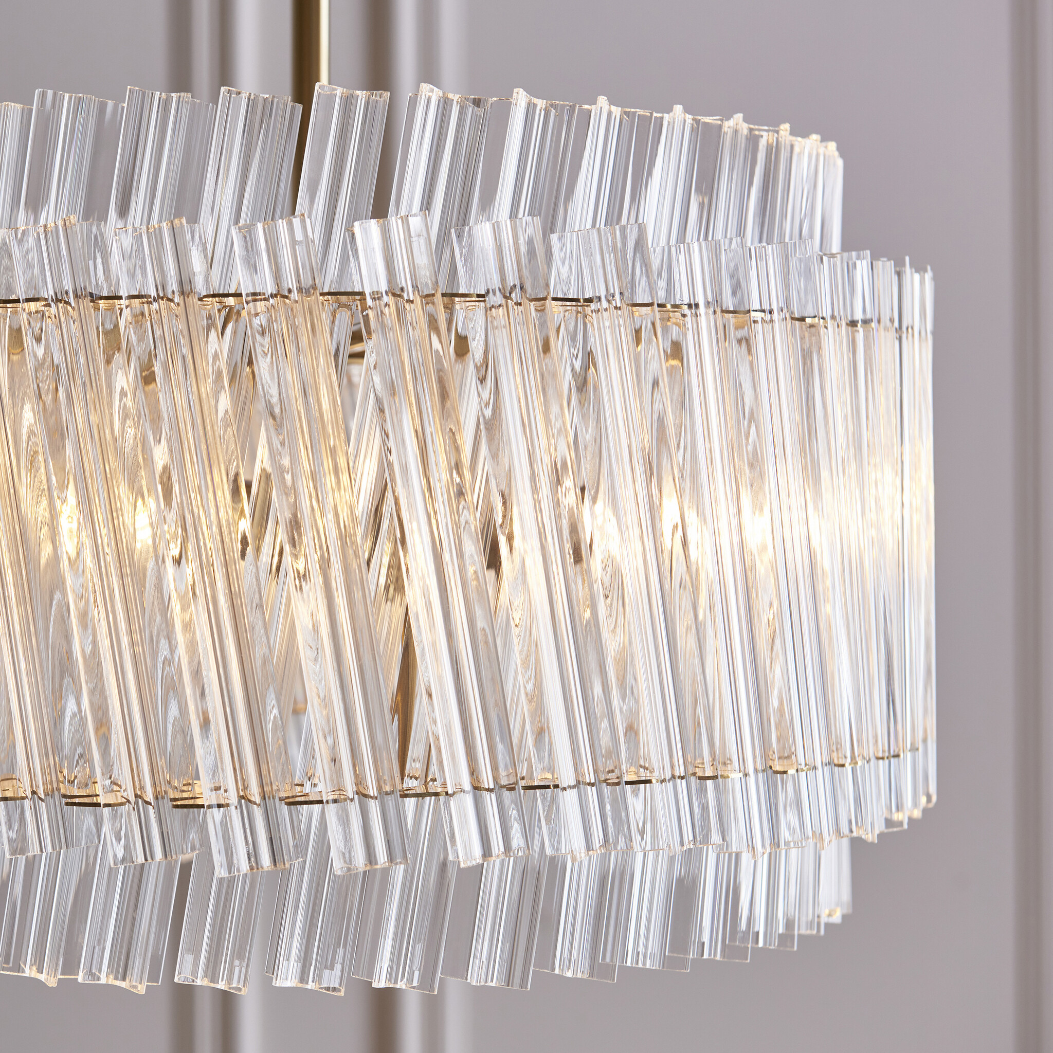 Add a touch of timeless sophistication to your interior with this exquisite 3-light pendant, masterfully crafted with brushed aged brass metalwork and double-layered, high-clarity glass rods that shimmer beautifully when illuminated.