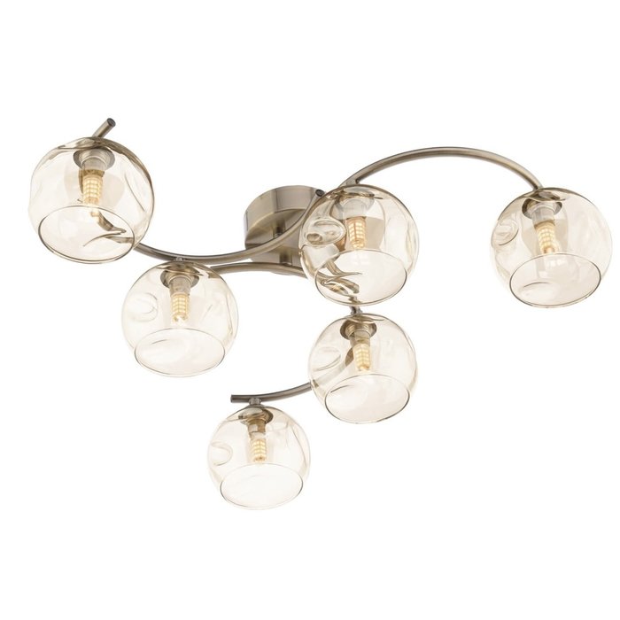 The Natalie 6 Light Semi Flush ceiling light is finished with an antique brass frame and champagne organic shaped glass shades surrounding the G9 lamps. The six lights are capable of great light output, and the gracefully curving arms give a generous diameter of 60cm, ensuring the light spill covers a larger area. Combined with a height of just 16cm, make this a great choice for larger rooms and low ceiling areas.