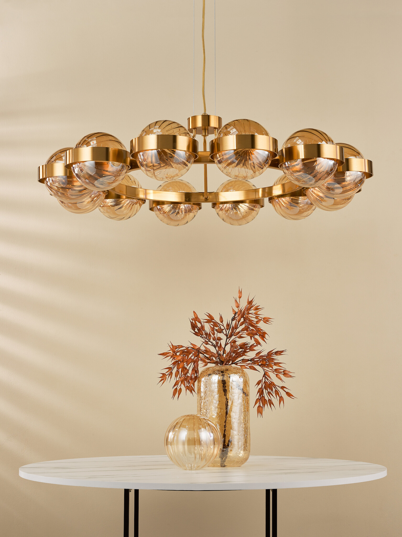 The Ophira Amber Ribbed Glass & Antique Gold Modern Chandelier – 12 Light is a grand, oversized chandelier designed to bring drama and elegance to large interiors. Finished in antique gold, it showcases twelve amber ribbed glass globes that diffuse a warm, atmospheric glow, balancing impact with refinement.