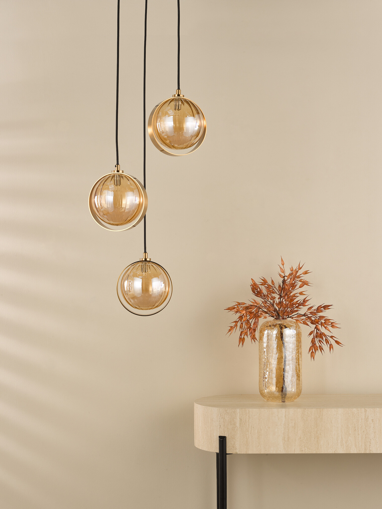 The Ophira Amber Ribbed Glass & Antique Gold Cluster Pendant Light combines Danish-inspired elegance with a refined industrial twist.