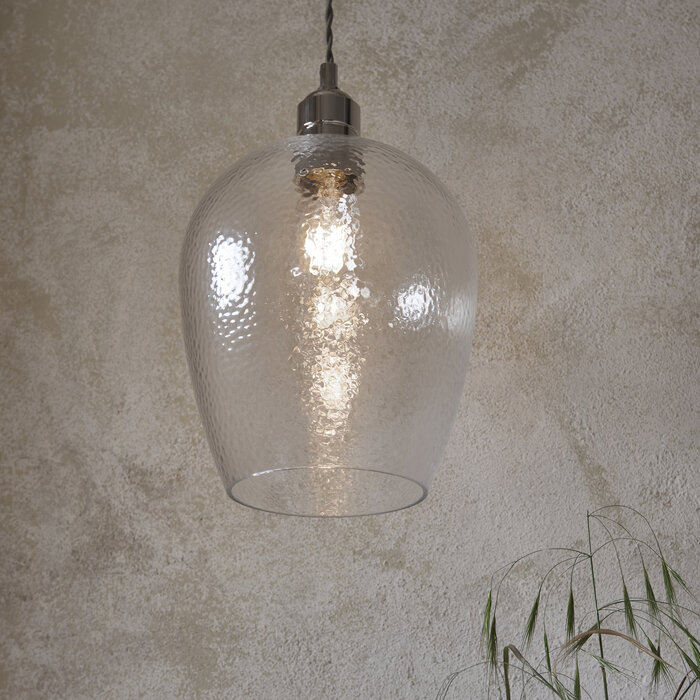 This is a stunning glass kitchen pendant light in a small size that has all the detailing you are looking for. The hammered clear glass shade damples the light and the bright nickel finish metalwork is perfect for those that love shine. The grey twisted flex is height adjustable on installation.